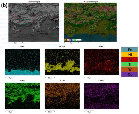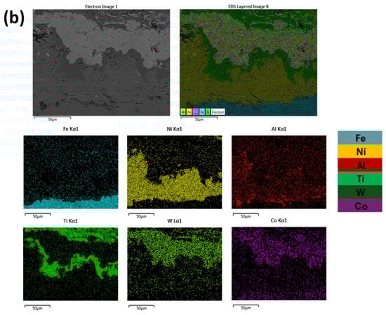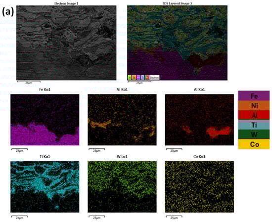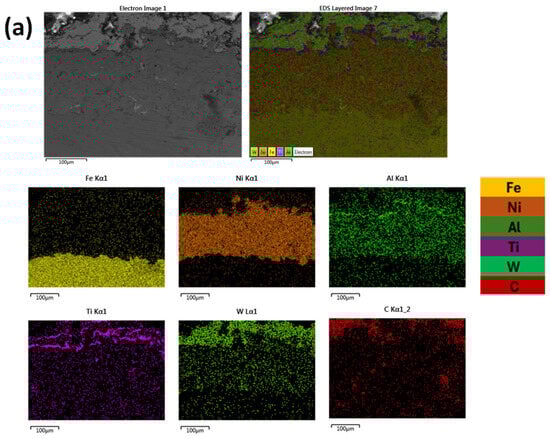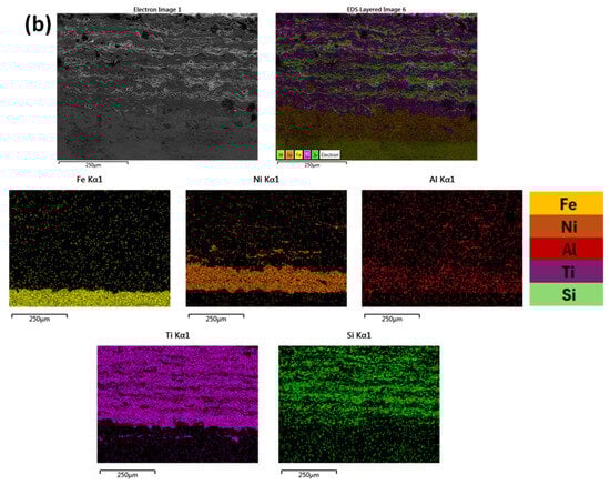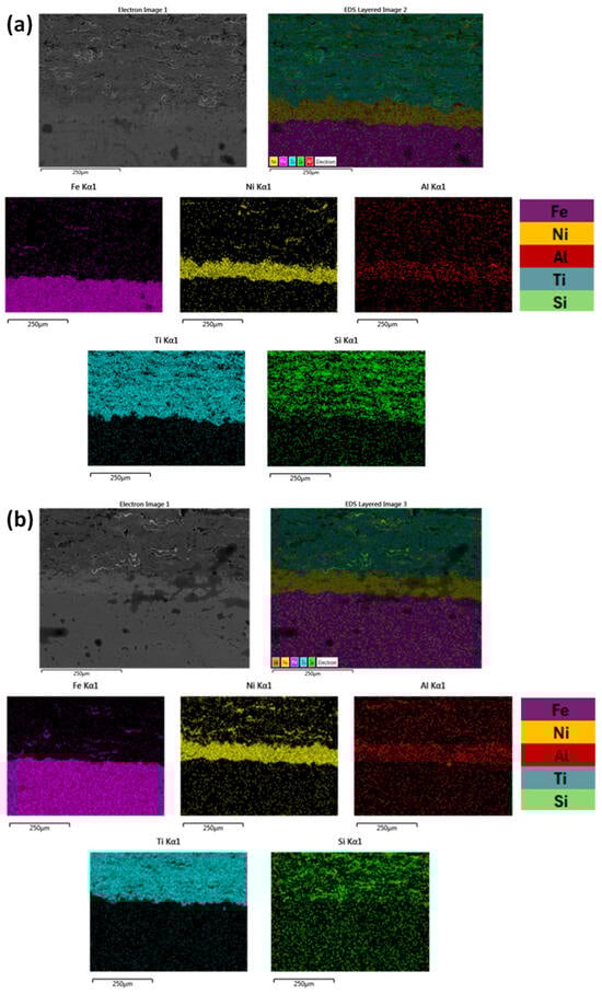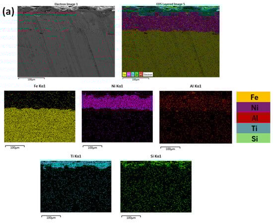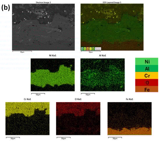 It can be observed from Figure 7, that in both cases, the distribution of elements are uniform and in alignment with the different deposition layers. Based both on Figure 6 and Figure 7 and especially as far as the substrate/primary Ni-Al layer is concerned, there is not significant evidence of intensive chemical reactivity and subsequent reaction phases. Some elemental interdiffusion between the two areas is expected to have taken place, contributing to enhancement—apart from the mechanical interlocking—of the interphase bonding.