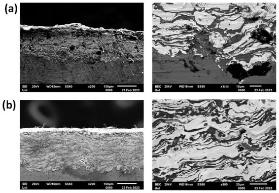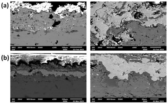 The microstructure characterization of the Ti-WC/Co coatings layer-by-layer at 800 A and ×200 and ×900 magnification and, is presented in Figure 8a. The coating exhibits unevenness, lacking uniform thickness, and showing suboptimal adhesion to the substrate. Furthermore, a discrete separation between the different deposited layers is not obvious. Microcracks/flaws and porosity are evident with the latter in some cases being of big size. Porosity and microcracks were measured to cover a 15–16% of the area. The measured thickness of the coating was measured to be 180–200 μm for the Ni-Al layer and 55–85 μm for the Ti-WC/Co layer. On the other hand, the microstructure characterization of the Ti-WC/Co layer-by-layer coatings at 900 A and at ×200 and ×700 magnification is depicted in Figure 8b. Overall, the coating exhibits a more uniform behavior compared to the Ti-WC/Co layer-by-layer coatings at 800 A. Specifically, while the coating does not have uniform thickness, the layers appear thinner, with coating thickness measured to be around 50–75 µm for the Ni-Al layer and 70–120 μm for the Ti-WC/Co. As in the case of the Cr2O3 coatings, this difference in thickness is a random outcome of the manufacturing process. Some microcracks/flaws and porosity is also evident, which were measured to be within the range of 5–6% of surface coverage. Additionally, it seems that a better adhesion of the coating to the substrate has been established.