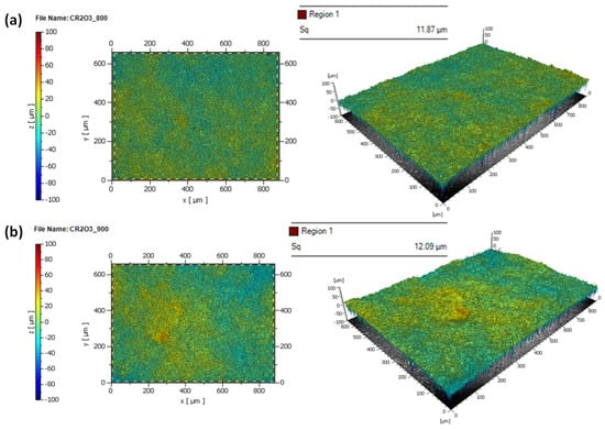 The results of two-dimensional and three-dimensional profilometry for samples coated with Cr2O3 are presented in Figure 16. The results at 800 A are shown in Figure 16a, with the average roughness value (Sq) measured at 11.87 µm. Respectively, in Figure 16b, corresponding to 900 A, the value is 12.09 µm. Thus, the average roughness value remains similar at both current values.