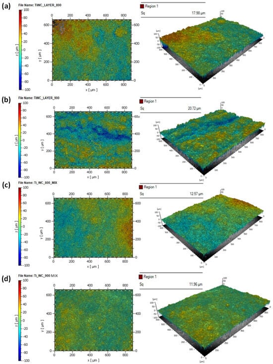 The two-dimensional and three-dimensional representations of profilometry results on samples with Ti-WC/Co coatings are presented in Figure 17, which corresponds to the (a) layer-by-layer coating at 800 A, (b) layer-by-layer coating at 900 A, (c) mix coating at 800 A, and (d) mix coating at 900 A. At 800 A, the average roughness value of the layer-by-layer coating is 17.98 µm, while at 900 A it is 20.72 µm. For the mix coatings, the average roughness value at 800 A is 12.57 µm, while at 900 A it is 11.96 µm. Therefore, the roughness values of coatings with Ti-WC/Co mix are nearly identical to those of Cr2O3, which is noteworthy considering that Ti-WC/Co mix coatings could potentially have a reduced environmental impact compared to Cr2O3. The comparison of roughness values between Cr2O3 and Ti-WC coatings highlights that the Ti-WC mix coatings achieve similar surface roughness to Cr2O3. This is significant because Cr2O3 is a widely used but environmentally harmful material, whereas Ti-WC offers a more sustainable alternative. Demonstrating comparable roughness supports the suitability of Ti-WC as an eco-friendly substitute for applications where surface topography is critical.