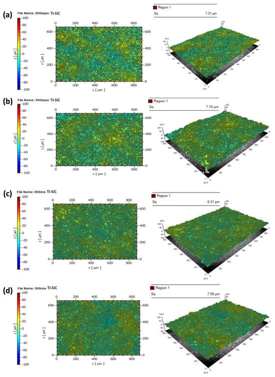 The two-dimensional and three-dimensional profilometry results of Ti-SiC/Co coatings are presented in Figure 18, with corresponding to the (a) layer-by-layer coating at 800 A, (b) layer-by-layer coating at 900 A, (c) mix coating at 800 A, and (d) mix coating at 900 A. For the layer-by-layer coatings, the average roughness values were 7.13 µm at 800 A and 6.72 µm at 900 A. For the mix coatings, the roughness values were 6.95 µm at 800 A and 7.21 µm at 900 A. These values are substantially lower than those of both Ti-WC and Cr2O3 coatings, indicating that Ti-SiC produces smoother surfaces. This reduction in roughness is significant because it enhances corrosion resistance and may contribute to improved tribological behavior, further supporting the potential of Ti-SiC as an eco-friendly alternative to conventional Cr2O3 coatings.