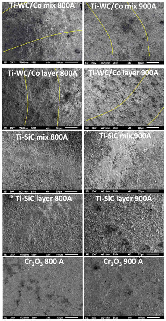 Wear rates () for the 0–200, 200–1000 m, and overall distance of each sample. It can be observed that the Ti-WC/Co mix system at 900 A is the system with the lowest wear rated compared to the other systems.