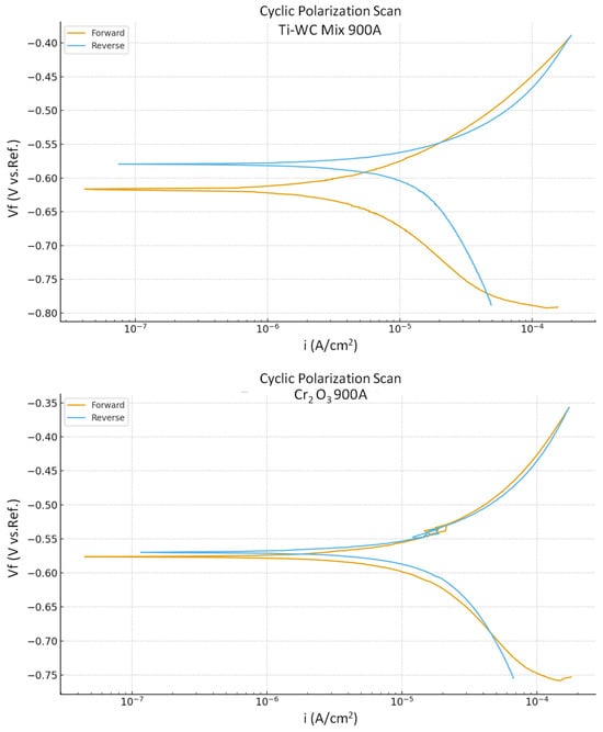 The representative potentiodynamic cyclic polarization curves of the samples in aqueous corrosion are shown in Figure 22 (Ti-WC mix 900 A and Cr2O3 800 A samples), while Table 6 provides the corresponding values extracted from the curves of all samples, including the equilibrium open circuit potential (Eocp), corrosion potential (Ecorr), reverse corrosion potential (Ecorr rev), and corrosion current (Icorr) and Table 7 illustrates the corrosion current density percentage change in PS coatings compared to Cr2O3. Figure 22 illustrates this behavior, where the Ti-WC mix coating at 900 A shows lower corrosion current and a more stable passivation loop compared to the Cr2O3 coating at 800 A. In the samples Ti-WC/Co mix (800–900 A) and Ti-SiC mix-layer (800–900 A), during the anodic part, a region of active corrosion emerges. Subsequently, an increase in current density occurs alongside a rise in potential until the conclusion of the anodic part; this behavior is confirmed by the literature [,,]. Following this, the reverse curve shifts to the left, forming a positive lag loop. Moreover, considering that the reverse potential exceeds the potential of the rectum, it can be inferred that this sample does not exhibit localized forms of corrosion. Furthermore, the fact that these samples demonstrate very low corrosion currents indicates a highly effective anti-corrosion behavior. In the Cr2O3 samples, the anodic part in the right bias section exhibits the same behavior as the Ti-WC/Co layer samples. The reverse curve shifts from the right, forming a small loop. Notably, the reversal potential is only a few millivolts above the corrosion potential. Consequently, localized forms of corrosion are not prominent issues in these tests, and the corrosion currents are of very low intensity. Specifically, at 800 A, the coating shows mostly general corrosion, as evidenced by the similarity between the forward and reverse curves.