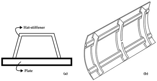 Metal plates are widely employed in several branches of engineering, typically serving both structural and cladding functions. The addition of stiffeners to these plates provides unique advantages in terms of structural efficiency and design, as it significantly increases strength while keeping the overall structural weight relatively low. Stiffened plates are commonly used in aerospace, marine, and civil engineering structures [,,,,]. Various stiffener geometries exist, each imparting distinct characteristics to the mechanical behavior of the plate. In this study, the hat-stiffener type is adopted, as illustrated in Figure 1a. Figure 1b shows an application employing hat-stiffeners in an aircraft fuselage section.