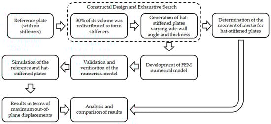 It is worth emphasizing that in addition to the works already discussed, several other studies [,,,,,,,,,,] have further explored the mechanical behavior of hat-stiffened plates made of composite materials, whereas thin steel plates with hat-stiffeners remain a relatively underexplored topic in the literature. This observation highlights the scientific motivation of the present study, which focuses on the geometric optimization of thin steel plates with hat-stiffeners and aims to extend the Constructal Design approach to metallic structures.