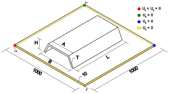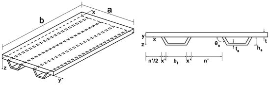 As stated earlier, the material adopted is ASTM A36 structural steel, with a Young’s modulus E = 200 GPa and Poisson’s ratio ν = 0.3 [,]; this material has also been employed in previous studies [,,,]. Regarding boundary conditions, a uniformly distributed load of 10 kPa was applied; this load level was chosen to ensure that the plate remains within the linear elastic regime [,,,]. The edges were considered simply supported, as explained earlier, reflecting practical structural engineering applications. Figure 4 presents a schematic drawing of the plate with two hat-stiffeners. The choice of hat-stiffener thickness was based on the commercially available plate thicknesses that could be used to fabricate these stiffeners. Therefore, the following values were adopted: ts = 4.75 mm (3/16 in); ts = 6.35 mm (1/4 in); ts = 8.00 mm (5/16 in); ts = 9.53 mm (3/8 in); and ts = 12.7 mm (1/2 in). The stiffener side-wall angle θs was varied from 75° to 150° in increments of 5°. The width of the smaller base was fixed at bt = 40 mm. Using these parameters, by selecting the plate thickness and varying the side-wall inclination angle, other geometric parameters such as the stiffener height and larger base width were determined, generating multiple geometric configurations.