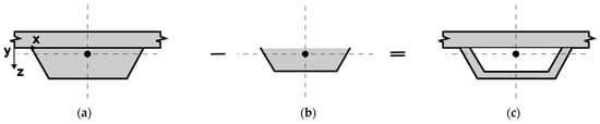 The procedure for determining the moment of inertia of each obtained geometry: (a) using the external contour of the section, disregarding the internal void; (b) computing the moment of inertia associated with the void region; and (c) subtracting the moment of inertia of the void from that of the external contour.