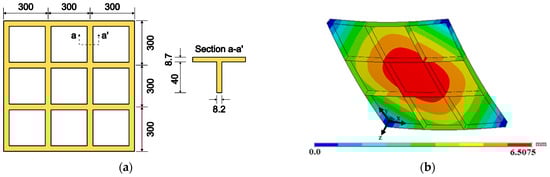Computational model validation: (a) schematic illustration of stiffened plate tested experimentally (in mm); (b) distribution of deflections obtained from proposed numerical model.