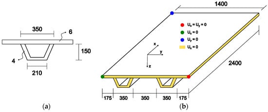 Subsequently, two computational model verifications were performed considering simply supported stiffened metallic plates. In the first case, the plate with two hat-stiffeners, modeled by Tharian and Nandakumar [], which used the SHELL63 and SHELL93 finite elements, was reproduced using the SHELL281 finite element. The results, in terms of the maximum deflections, were compared. The geometric characteristics of the plate can be seen in Figure 7. The material used was steel, with properties E = 210 GPa and ν = 0.3. The loading consisted of a uniformly distributed load of 10 kPa.