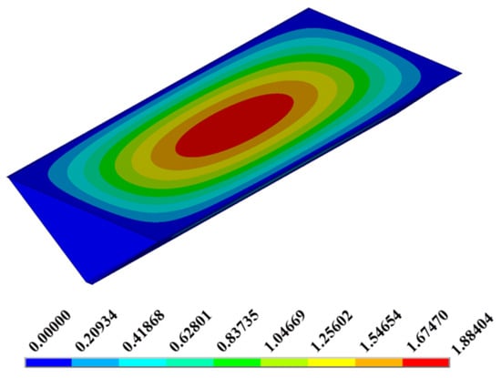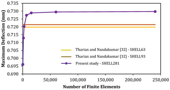 The performed mesh convergence test together with the results from Tharian and Nandakumar [] are presented in Figure 8. The maximum displacements reported by Tharian and Nandakumar [] were 0.7198 mm with the SHELL63 element and 0.7214 mm with the SHELL93 element, whereas the proposed model using square SHELL281 elements of 10 mm in a converged mesh yielded 0.7295 mm.
