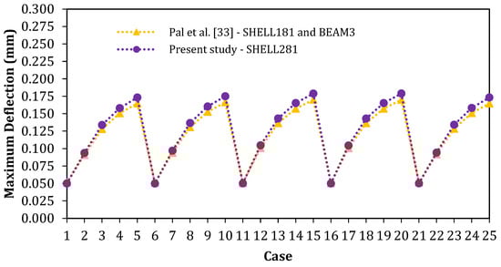 In turn, as shown in Figure 8, for the first verification of the computational model, using the results of Tharian and Nandakumar [], the difference between the SHELL281 and SHELL63 elements was 1.35%, and it was 1.12% between the SHELL281 and SHELL93 elements. Both results confirm the validity of the proposed numerical model. In the second verification, the results obtained by Pal et al. [] and those of the proposed model are as presented in Figure 9. Among all cases, the maximum relative difference was 5%, and the average relative difference was 3.3%, thereby confirming the accuracy of the proposed computational model. From these results, one can infer that the proposed numerical model was properly verified.