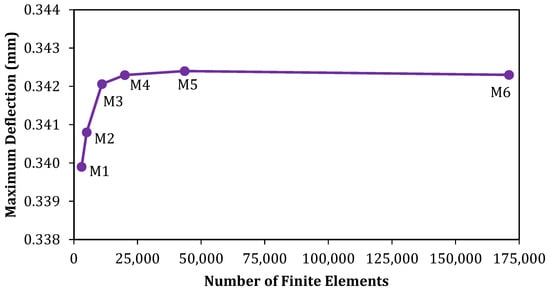 To determine the appropriate spatial discretization for all simulated hat-stiffened plates, a mesh convergence test was performed on the plate with the most complex geometry, i.e., the one with five hat-stiffeners. As in Alves et al. [,], SHELL281 finite elements with a square shape were used, with side lengths varying from 5 mm to 40 mm (M1 = 40 mm; M2 = 30 mm; M3 = 20 mm; M4 = 15 mm; M5 = 10 mm; and M6 = 5 mm). The results are shown in Figure 11, where it can be observed that the maximum plate deflection stabilizes starting from mesh M4. However, to avoid mesh dependency, mesh M5 with 10 mm elements was adopted for all numerical simulations.