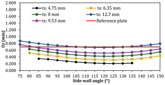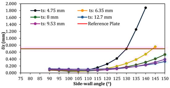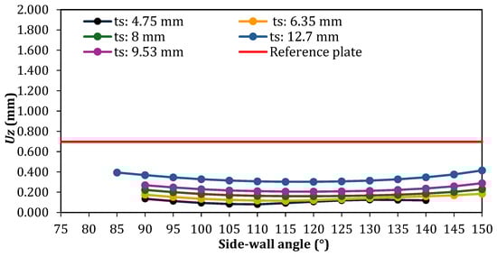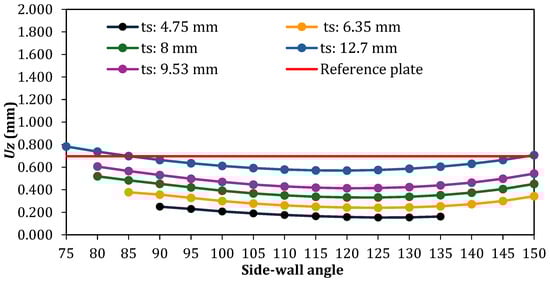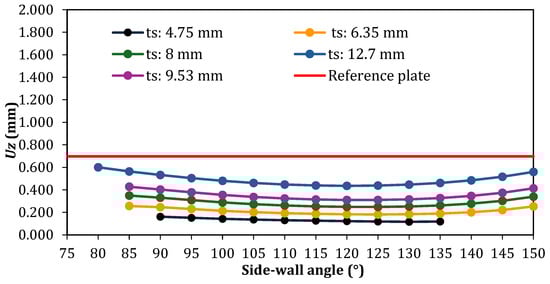 In the cases with a single stiffener (Figure 12), 60 geometric configurations were generated and analyzed. An atypical behavior was identified when compared to the other cases (Figure 13, Figure 14, Figure 15 and Figure 16). For all adopted ts values, it was observed that increasing the inclination of the stiffener side-walls initially leads to a reduction in the maximum deflection. However, upon reaching a certain value of θs, in plates with smaller ts, a sharp increase in the maximum deflection occurs. In plates with larger ts, this effect is less pronounced, presenting a more gradual increase in the maximum deflection. Another important feature is that, for these cases, the sharp increase occurs within specific θs values depending on the adopted ts value: θs = 105° for ts = 4.75 mm and ts = 6.35 mm and θs = 110° for ts = 8.00 mm, ts = 9.53 mm, and ts = 12.7 mm. Regarding deflections, one can also note that most geometric configurations exhibited a maximum deflection smaller than that of the reference plate, except for the case with ts = 4.75 mm and θs = 120°, which showed nearly the same out-of-plane displacement, as well as the cases with ts = 4.75 mm and θs = 135° and 140° and the case with ts = 6.35 mm and θs = 145°. The best result was obtained for ts = 4.75 mm when the hat-stiffener side-walls have θs = 105°, reaching a reduction of 93.72% in the maximum deflection compared to the reference plate.