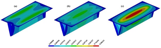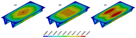 Figure 17 presents three cases with a single stiffener and ts = 4.75 mm, allowing for a comparative analysis of the displacement behavior under different inclination angles of θs = 100° (Figure 17a), θs = 105° (Figure 17b), and θs = 110° (Figure 17c). In Figure 17b, the minimum maximum deflection occurred at θs = 105°, since this geometry provided the best balance between the length of the larger base (bt + 2y′) and the dimension n’, resulting in a more uniform displacement distribution and the second highest moment of inertia among the cases with one stiffener (see Table A1). In contrast, Figure 17a shows the case with θs = 100°, where, despite having the greatest moment of inertia, displacement concentrations are observed in regions outside the stiffener (length n′). Finally, Figure 17c illustrates the configuration with θs = 110°, where a more pronounced displacement concentration shift to the region within the stiffener.