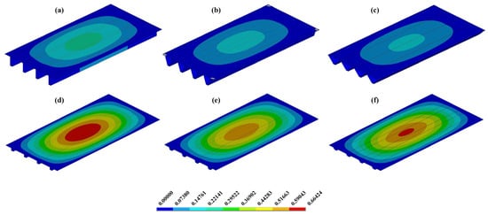 From Figure 19 it can be observed that when keeping the total steel volume constant, the use of thicker hat-stiffeners requires a reduction in their height. As a result, these configurations (Figure 19d–f) exhibit a displacement pattern more similar to that of the plate without stiffeners (reference plate). Conversely, when smaller thicknesses are adopted for the hat-stiffeners (Figure 19a–c), their height increases along with their moment of inertia, which enhances structural rigidity and explains the superior performance of these configurations.