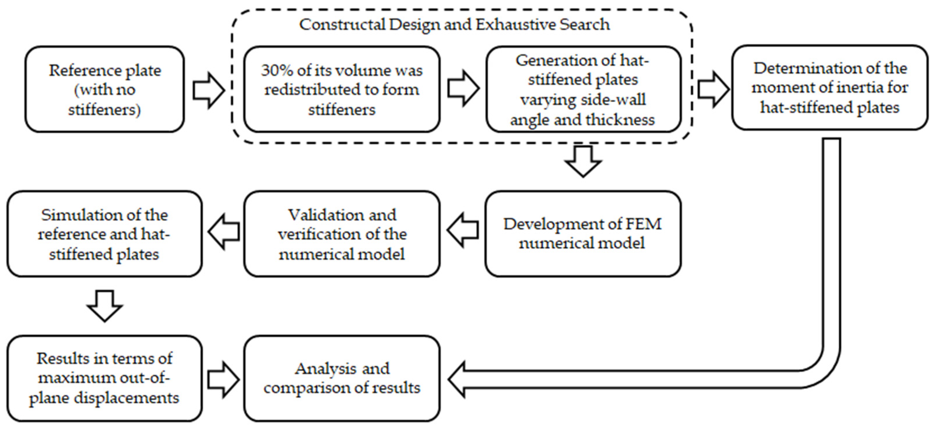 - Alves, M.A.; Rodrigues, E.M.; Pinto, V.T.; Rocha, L.A.O.; dos Santos, E.D.; Isoldi, L.A. Numerical Simulation, Constructal Design, and Systematic Search Applied to the Geometrical Evaluation of Hat-Stiffened Plates under Bending. Res. Eng. Struct. Mater. 2025, 11, 1–19. [Google Scholar] [CrossRef]