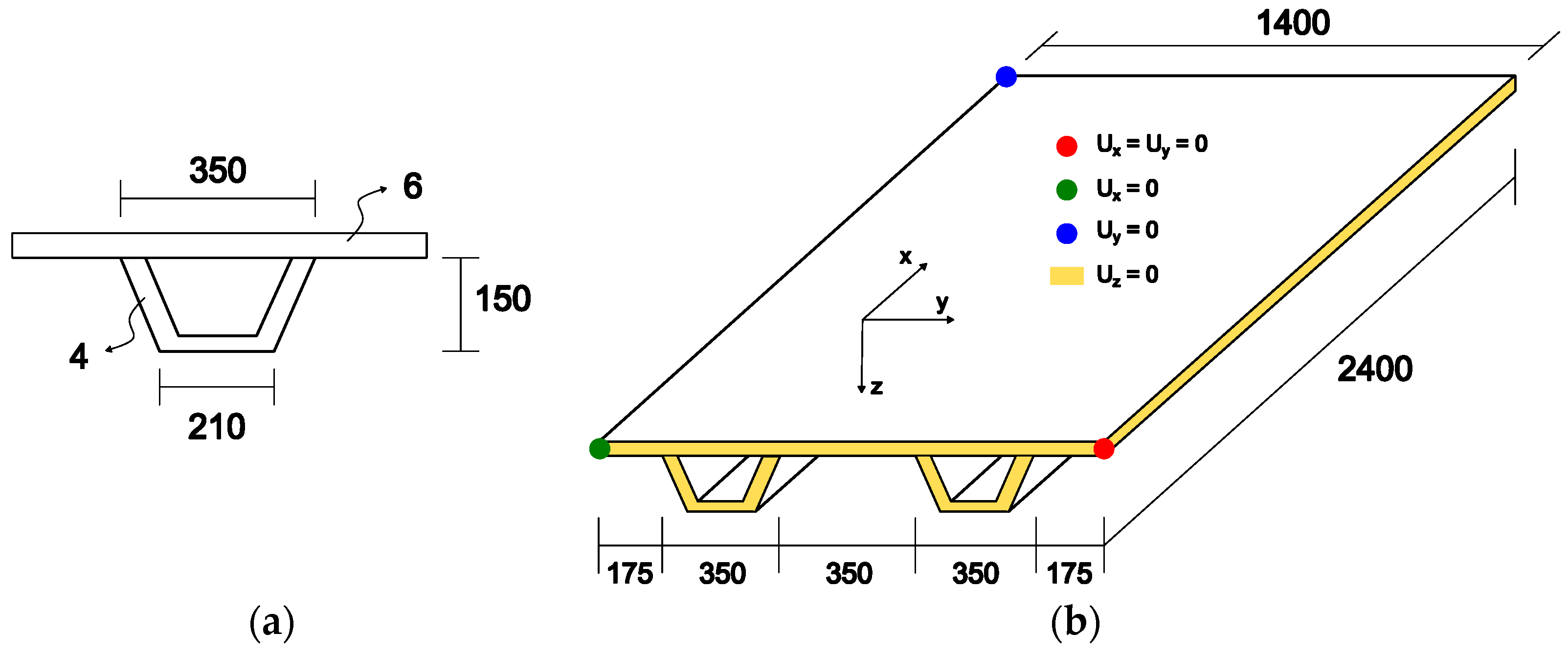 - Virág, Z.; Szirbik, S. Modal Analysis of Optimized Trapezoidal Stiffened Plates under Lateral Pressure and Uniaxial Compression. Appl. Mech. 2021, 2, 681–693. [Google Scholar] [CrossRef]