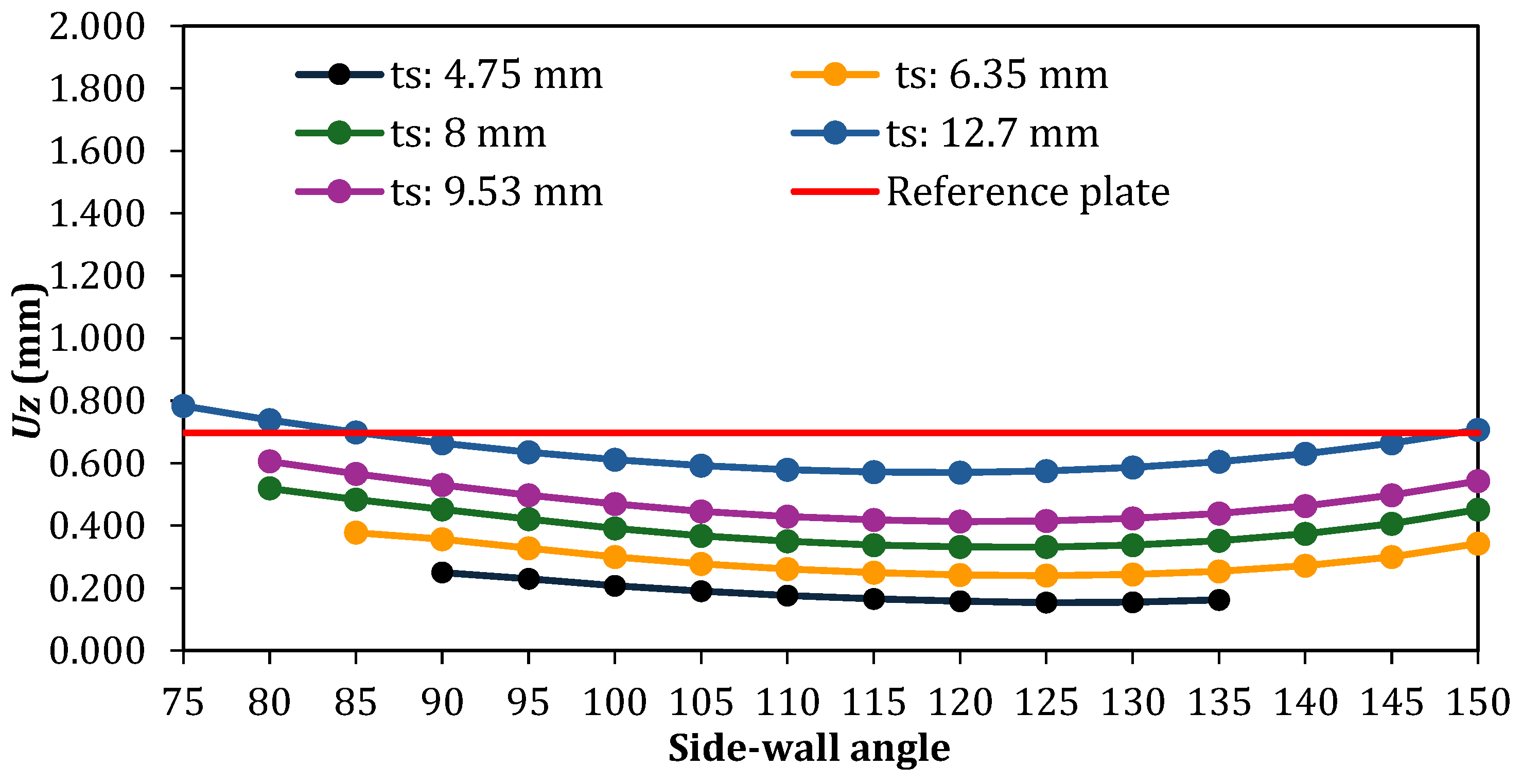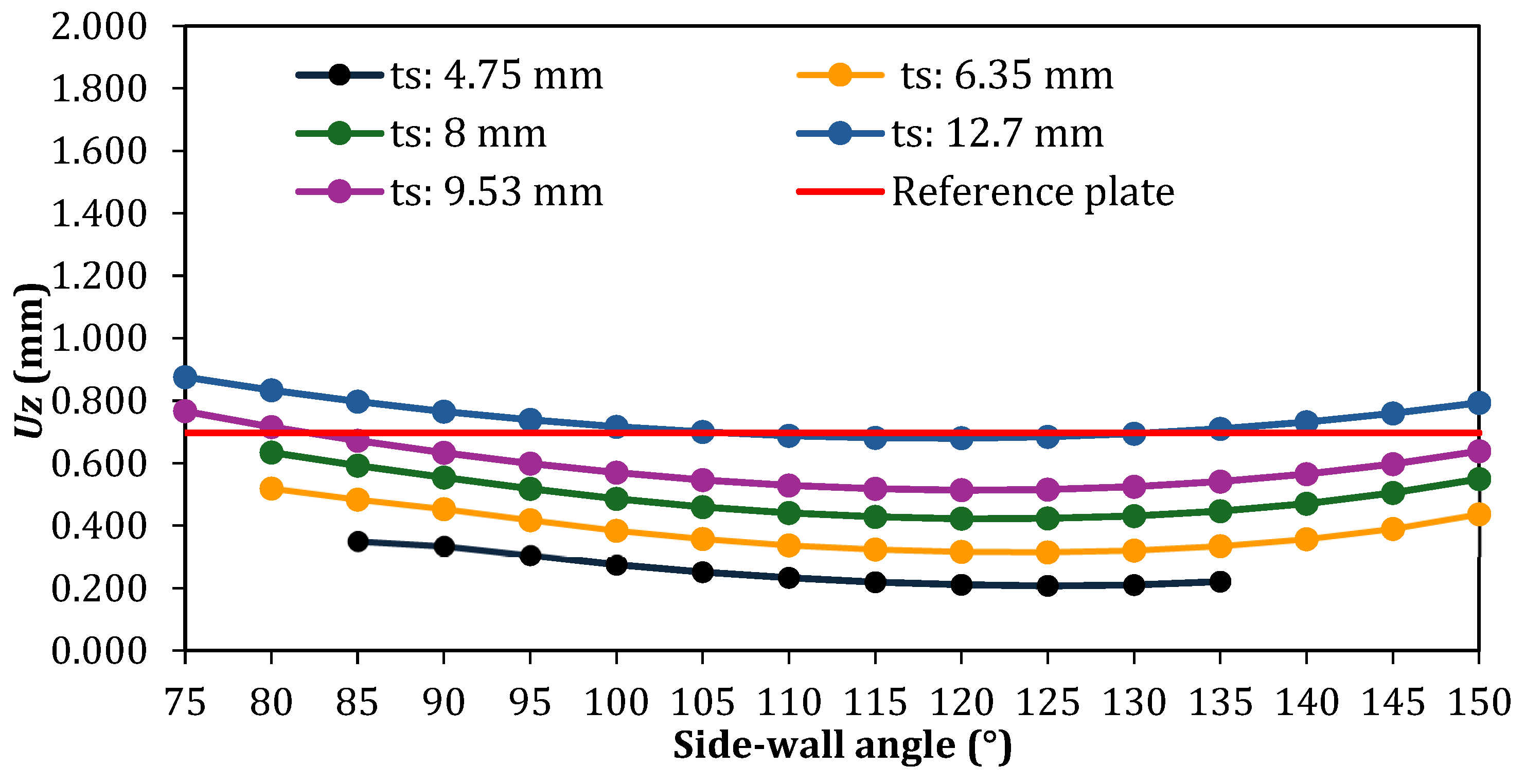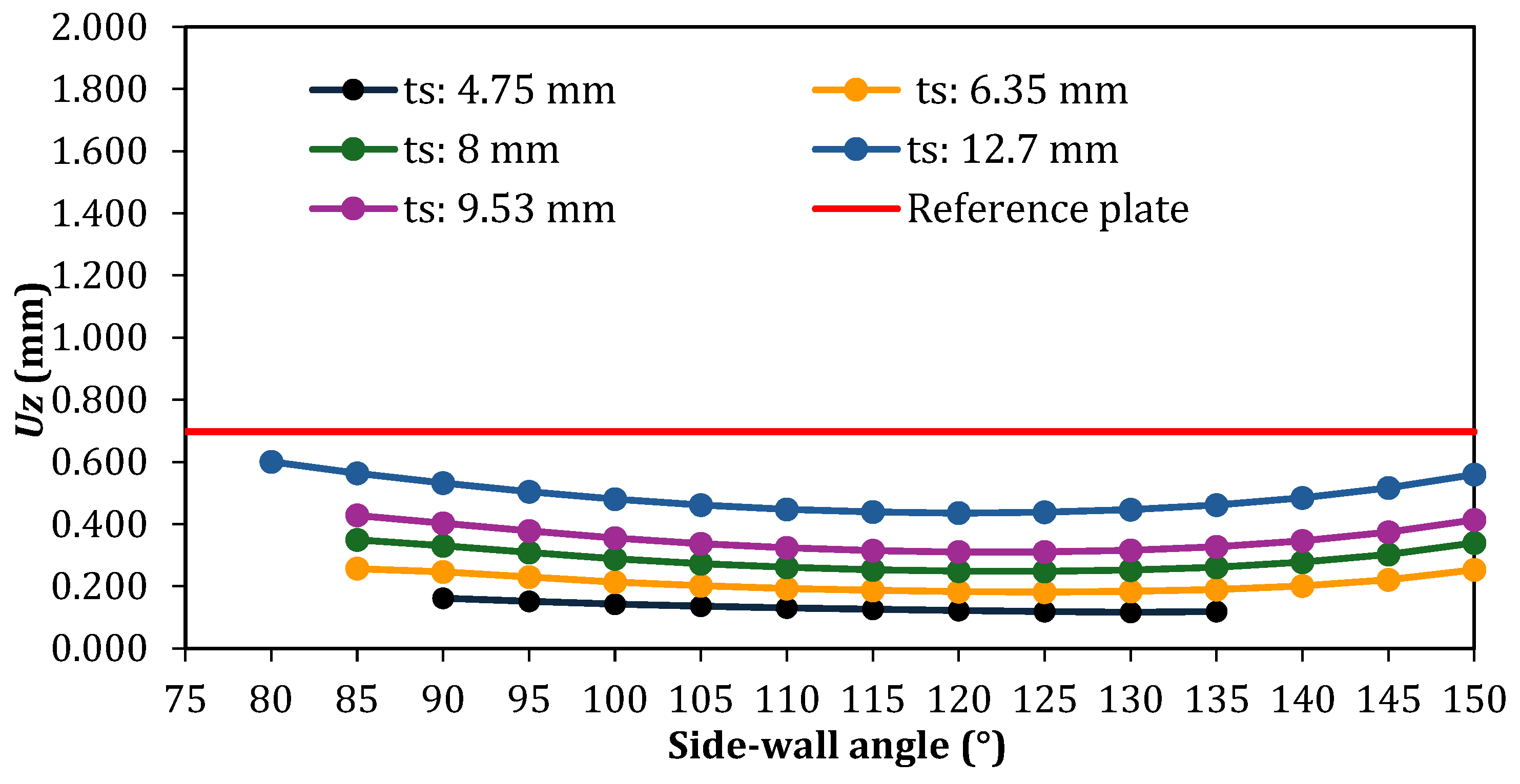 - The inclination angle of the side-wall of the hat-stiffener can influence its performance. Alves et al. [22] adopted θs = 120° and defined height levels. This difference allowed for a direct comparison of the results. The investigation developed in the present work identified a geometry that achieved an approximate 7.5% improvement over the best result obtained by Alves et al. [22] relative to the reference plate.