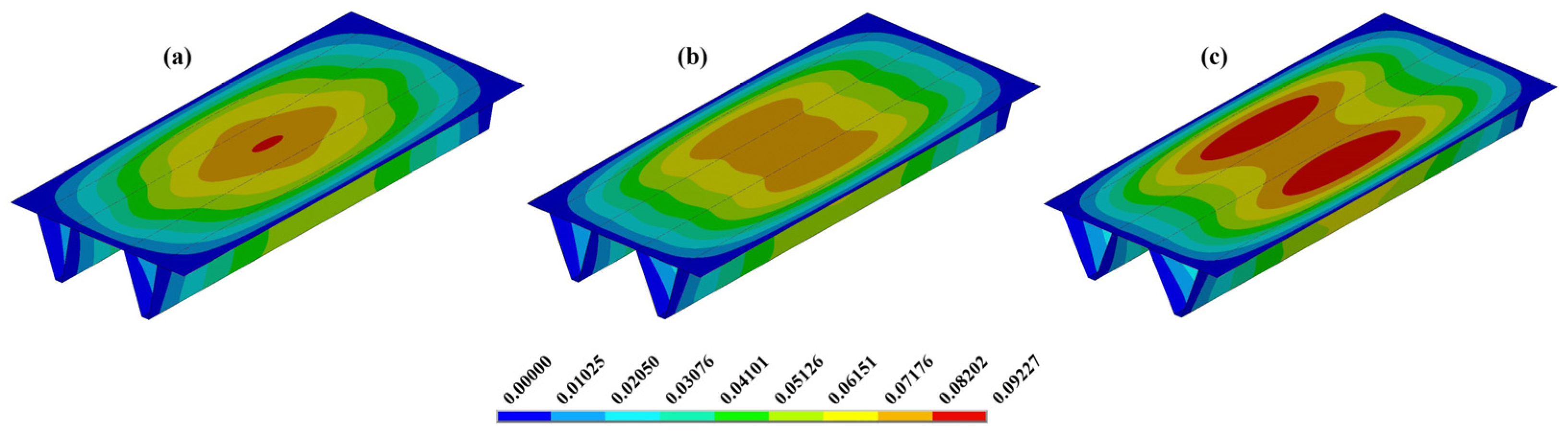 - Stiffener height emerges as an important parameter, since it shifts the structure’s centroid upward, enhancing the contribution of the minor base and the plate to the overall structural stiffness.