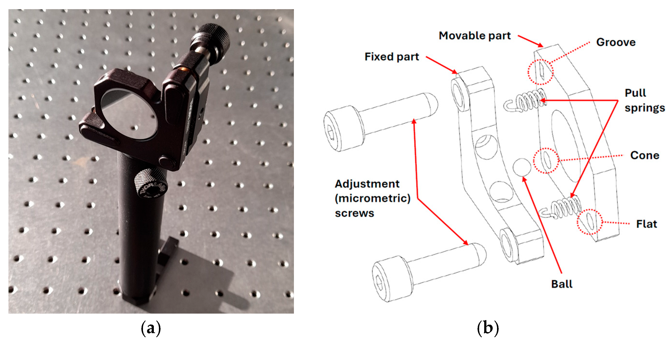 - Thorlabs—CF175 Clamping Fork for Ø1.25. Thorlabs.com. 2023. Available online: https://www.thorlabs.com/thorproduct.cfm?partnumber=CF175#ad-image-0 (accessed on 1 October 2025).