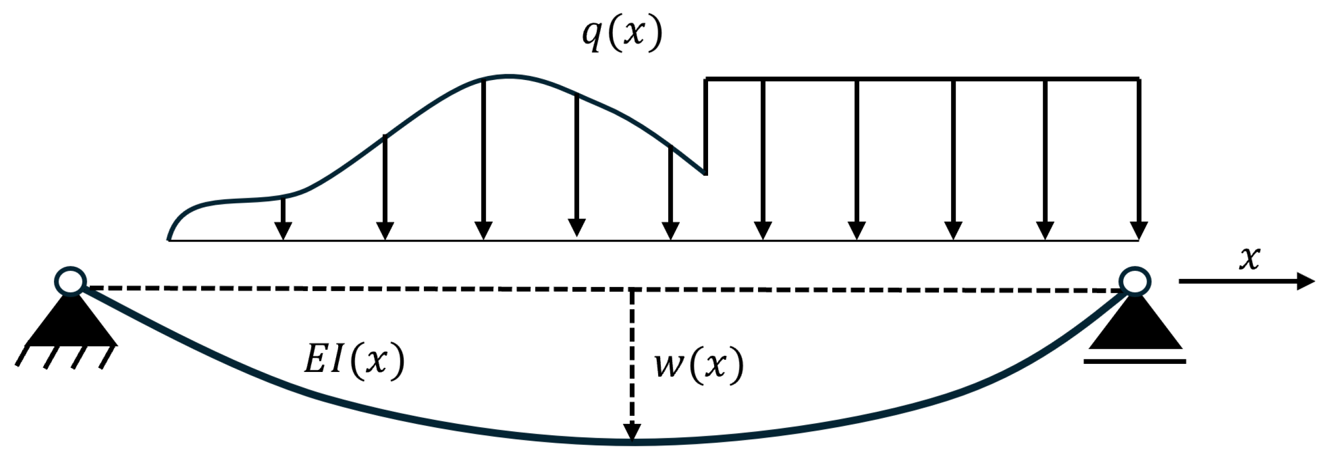 Scheme showing variables of the general bending beam setup. Loading q and bending stiffness are arbitrary functions of coordinate x. The supports can be of various kinds.