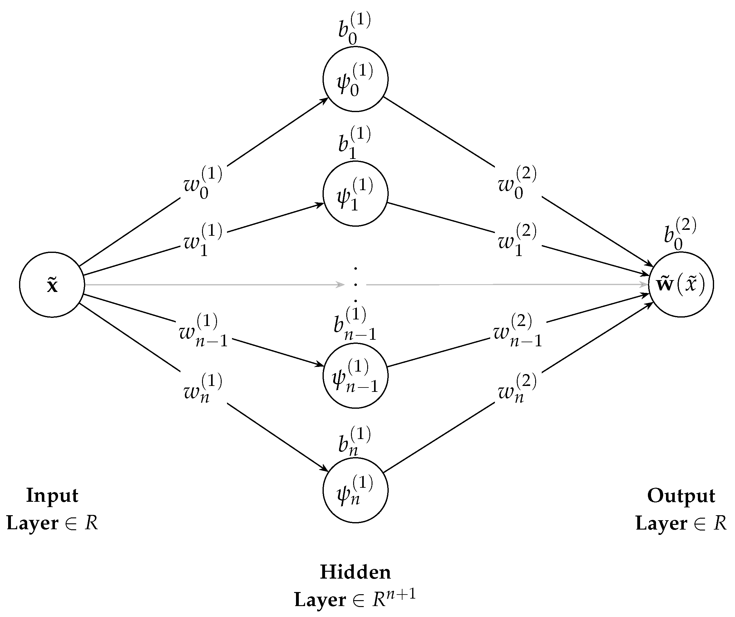 Network architecture representing the bending deflections of a single beam on the nondimensional length scale . are the linear weights of the input and hidden layers of the network, and and are the corresponding biases and activation functions of the neurons.
