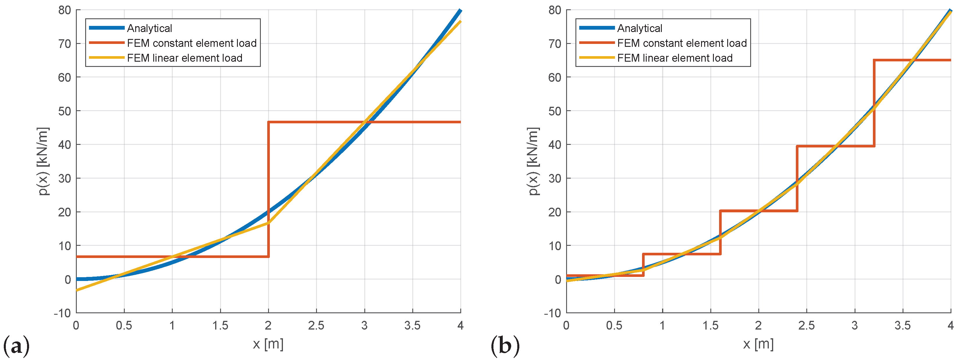 Cantilever with quadratic load: approximation of defined load function with constant and linear element loads using (a) two elements and three nodes; (b) five elements and six nodes.