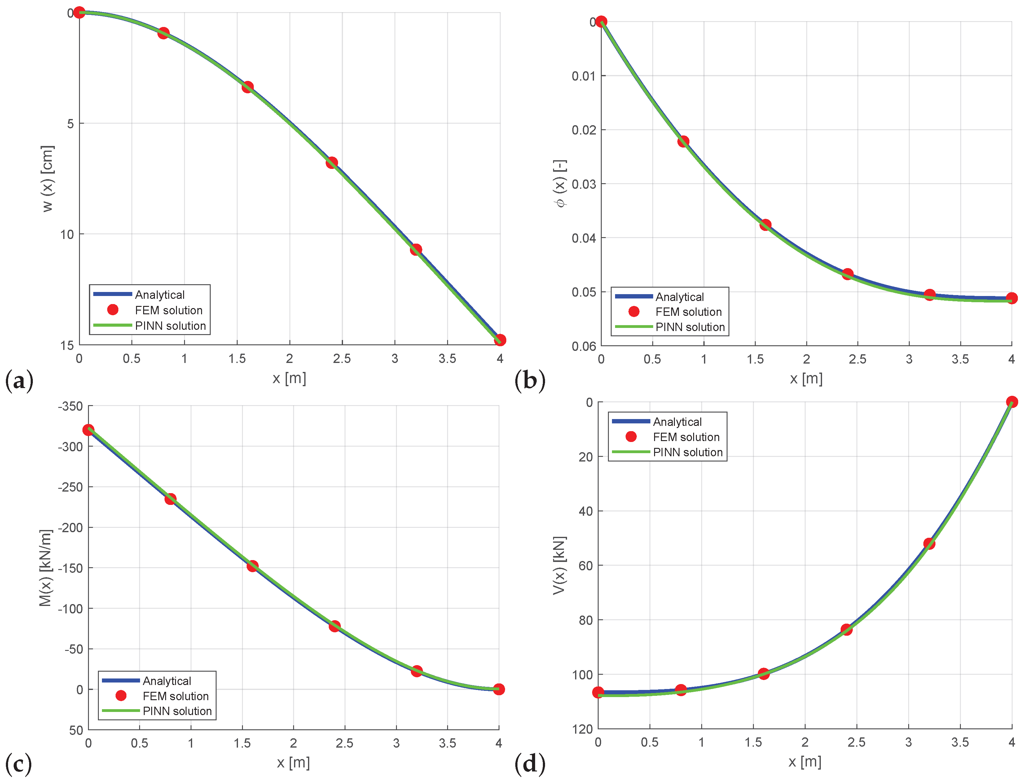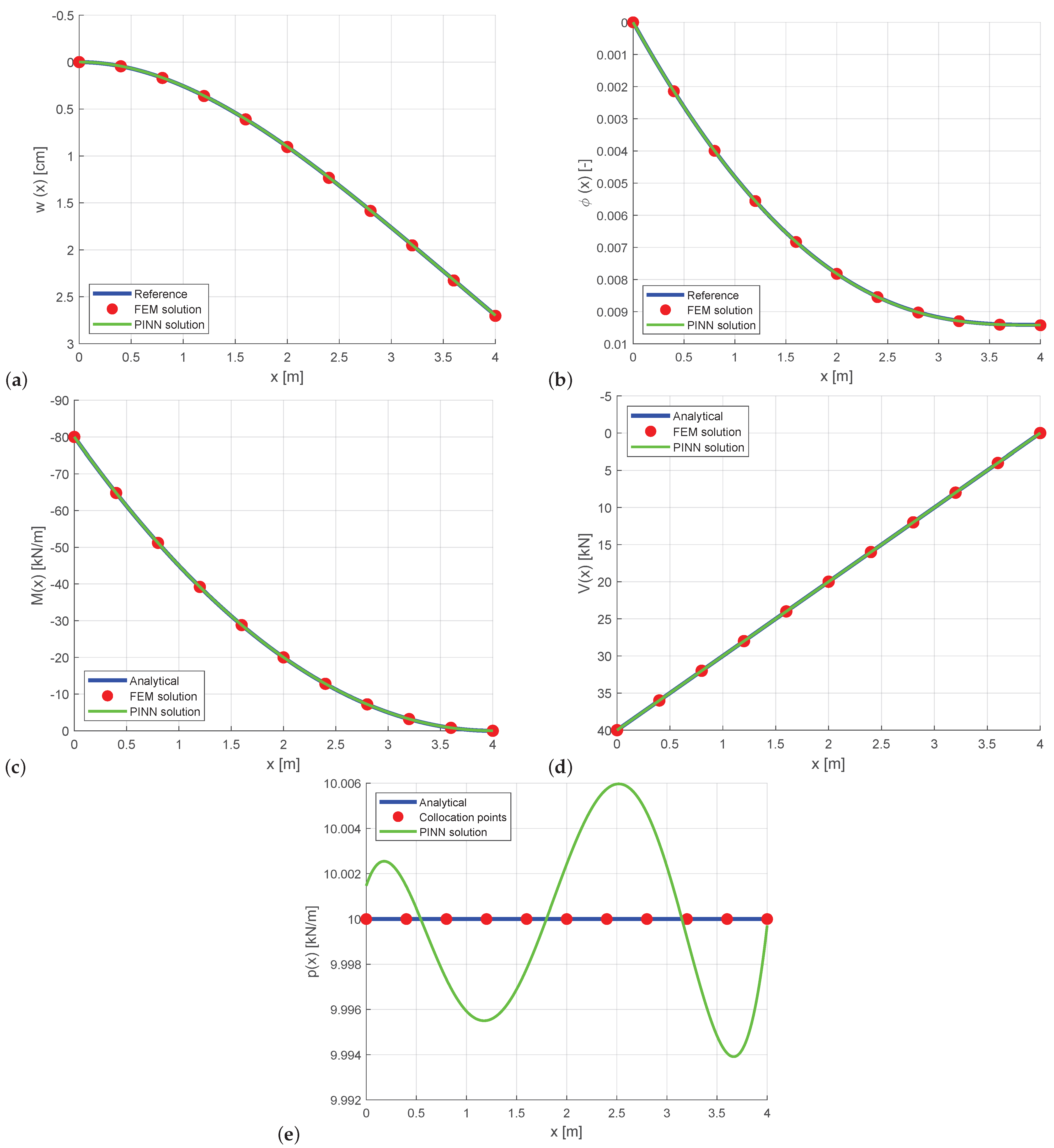 Cantilever with varying stiffness: comparison of FEM with 11 nodes with the PINN solution using 11 collocation points and 5 hidden neurons for the (a) bending displacement , (b) slope , (c) bending moment , (d) shear force , and (e) approximation of load function .
