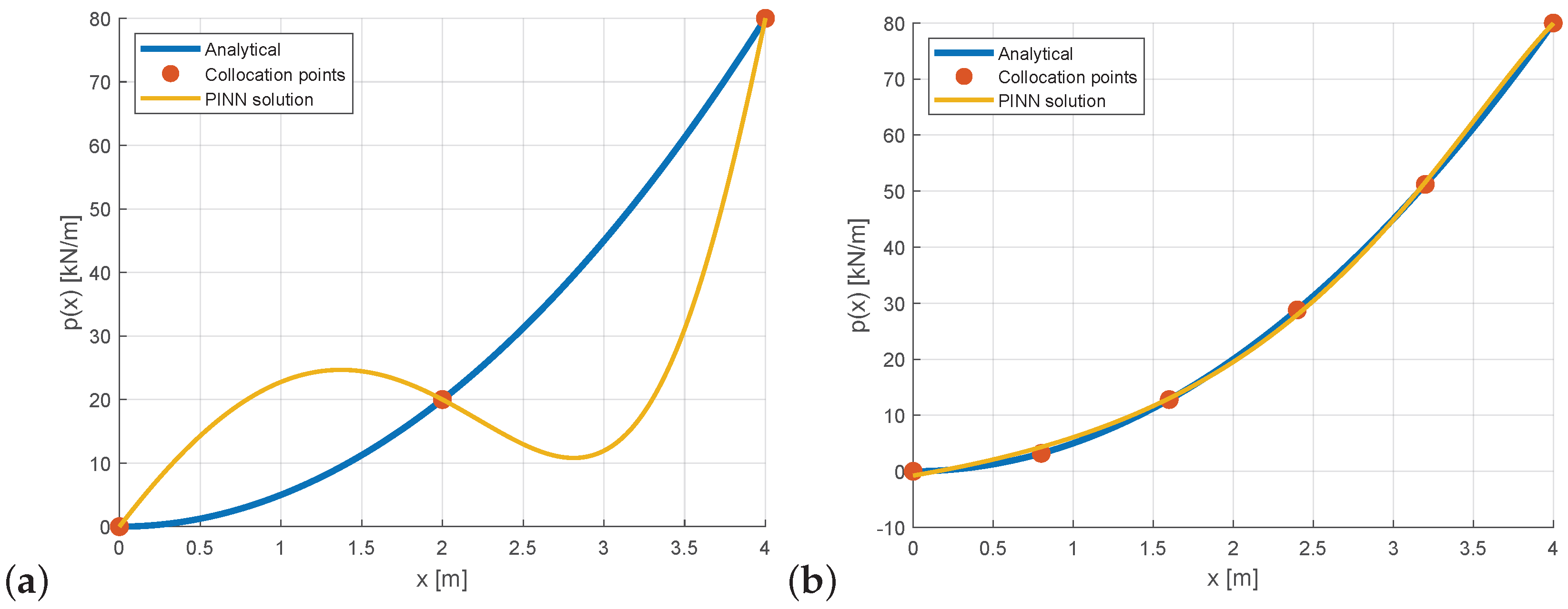 Cantilever with quadratic load: PINN approximation of defined load function with (a) three collocation points and five hidden neurons, and (b) six collocation points and three hidden neurons.