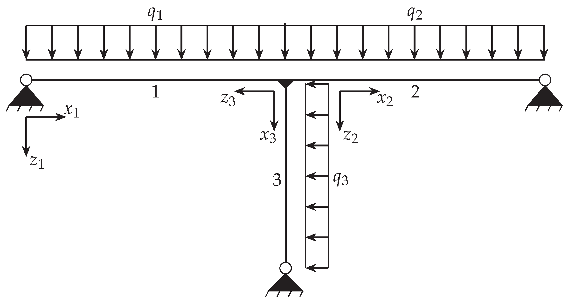 Different examples for the connection of structural elements and the corresponding coupling conditions: (a) two beams with rigid connection, (b) two beams with hinged connection, (c) rigid corner with two elements, and (d) rigid corner with three elements.