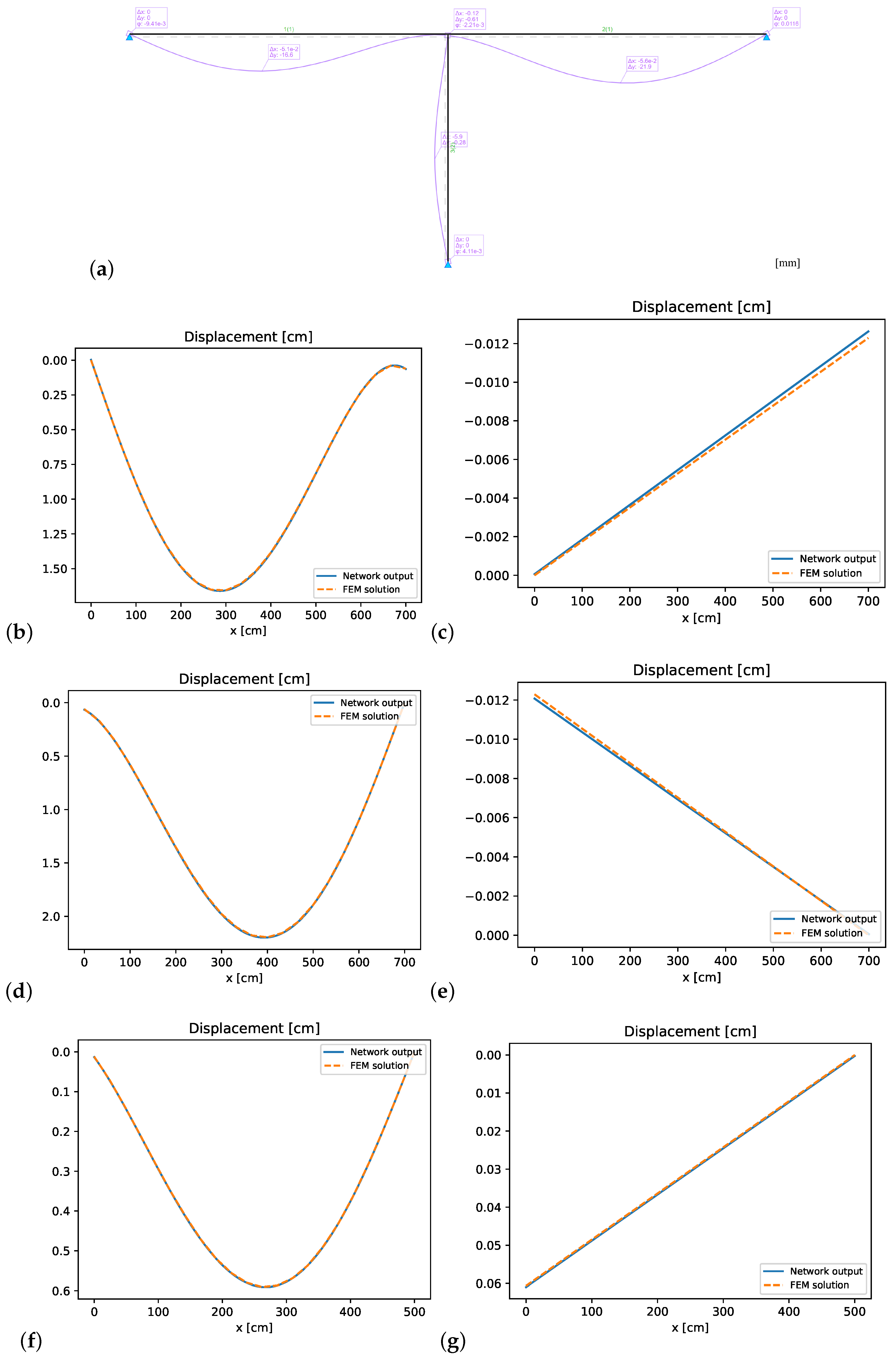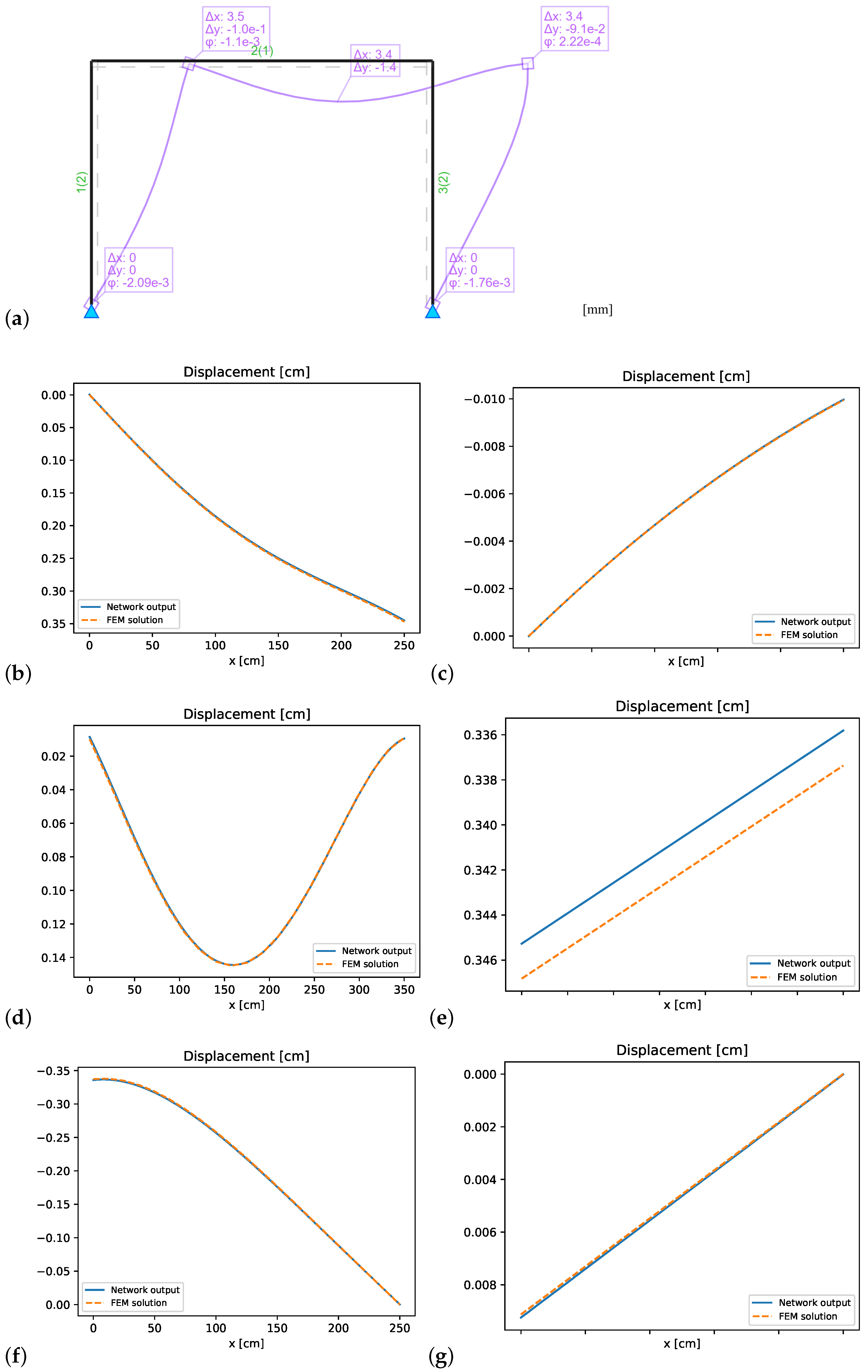 Double-hinged frame: (a) FEM reference solution for displacements, and comparison with PINN results: (b) bending displacements element 1, (c) axial displacements element 1, (d) bending displacements element 2, (e) axial displacements element 2, (f) bending displacements element 3, and (g) axial displacements element 3.