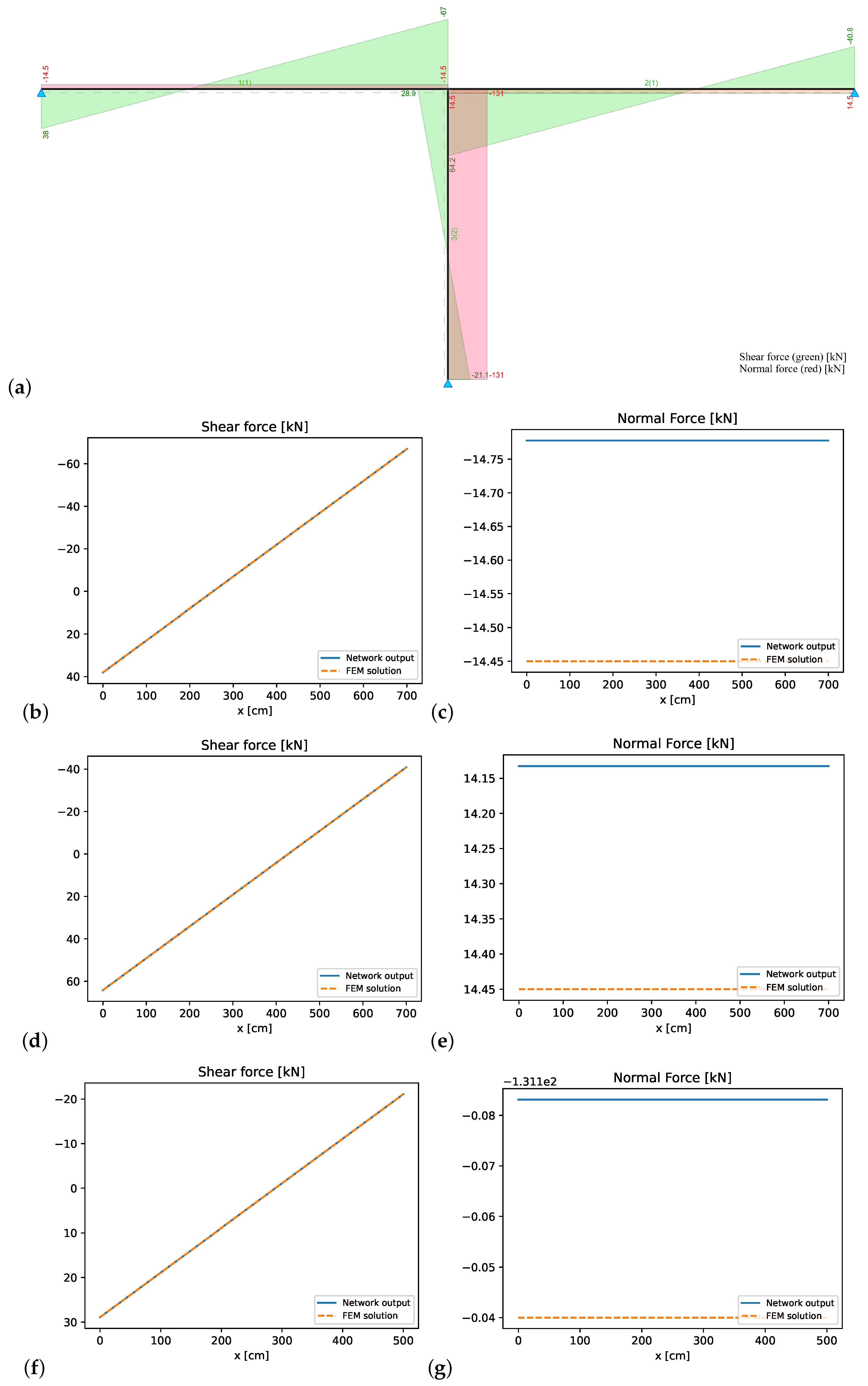 Double-hinged frame: (a) FEM reference solution for shear and normal forces, and comparison with PINN results: (b) shear forces element 1, (c) normal forces element 1, (d) shear forces element 2, (e) normal forces element 2, (f) shear forces element 3, and (g) normal forces element 3.