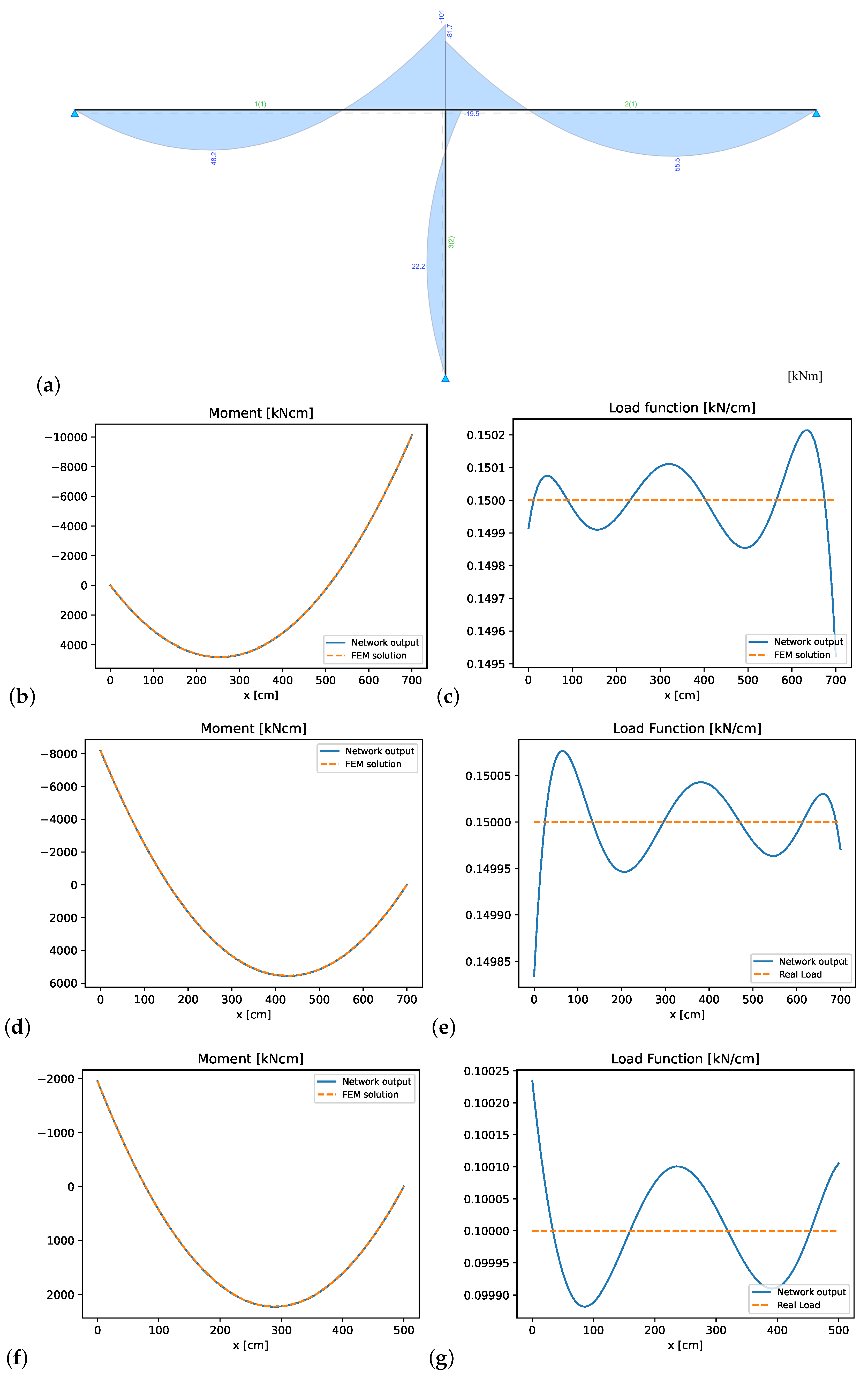T-structure: (a) FEM reference solution for bending moments, and comparison with PINN bending moments and load functions: (b) bending moment element 1, (c) load function element 1, (d) bending moment element 2, (e) load function element 2, (f) bending moment element 3, and (g) load function element 3.