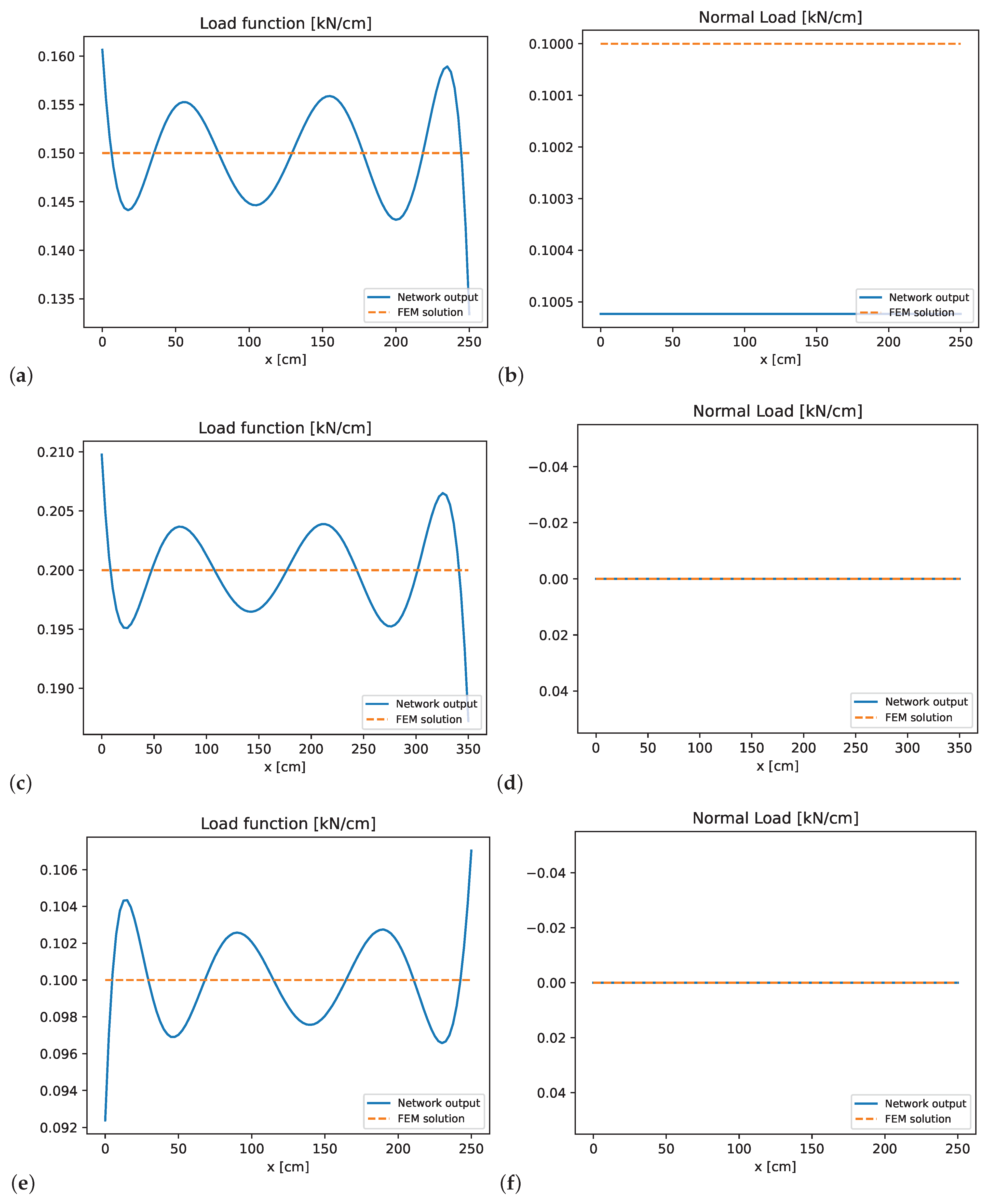 Double-hinged frame: PINN load function results: (a) transverse load element 1, (b) axial load element 1, (c) transverse load element 2, (d) axial load element 2, (e) transverse load element 3, and (f) axial load element 3.