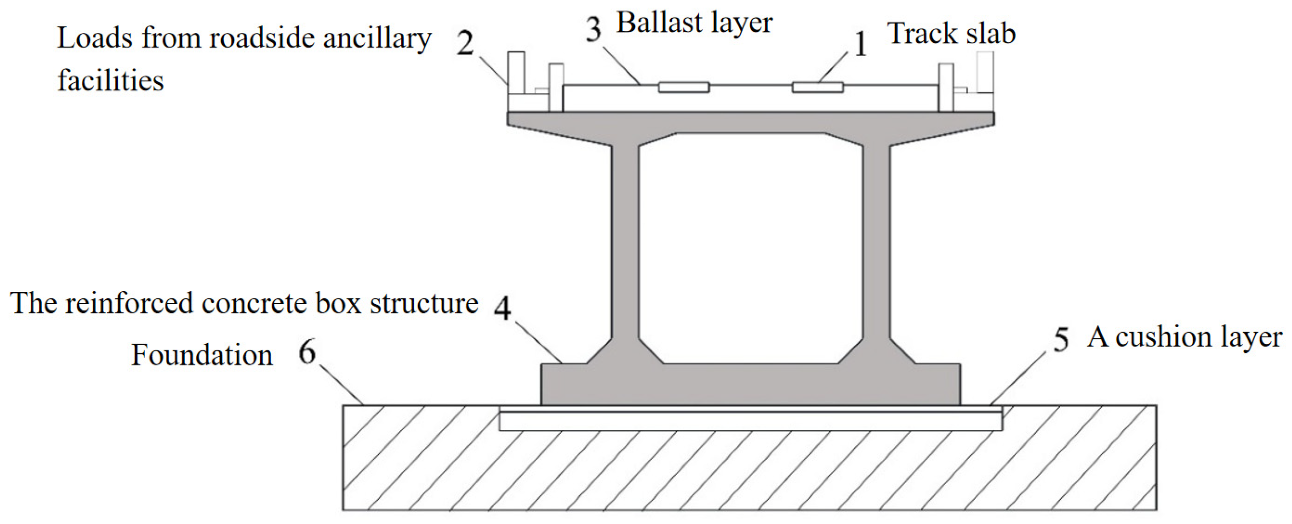 - Structural continuity assumption: It is assumed that the box-type subgrade has strict continuity and uniformity along the longitudinal direction, and the internal force distribution of any cross-section can represent the overall structural response.