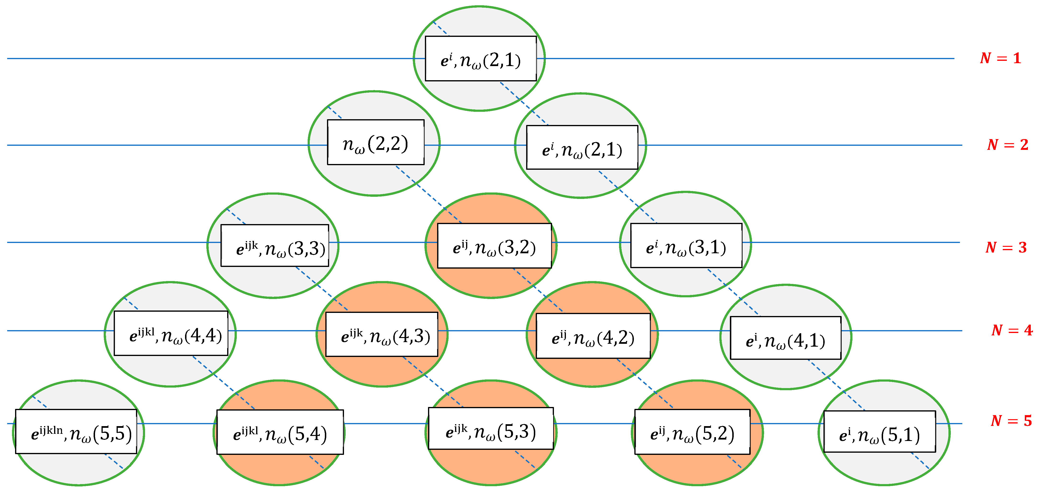 A Pascal’s triangle is a configuration of numbers arranged in the form of a triangular array. The numbers at the end of each row are set to 1, while the remaining numbers are calculated as the sum of the nearest two numbers in the preceding row. Pascal’s triangle constitutes an infinite triangular array of the binomial coefficients. Evidently, the number of unknowns exhibits a pattern consistent with that of the Pascal triangle. For compactness, the first right elements with one index are not displayed in