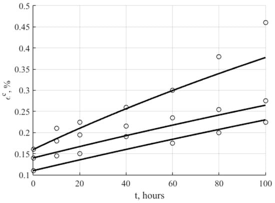 Creep curves for nickel alloy at a constant temperature [K] under stresses : bottom line—180 [MPa]; middle line—200 [MPa]; top line—250 [MPa]; circles—experimental points [15].
