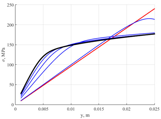 Pure bending stresses changes in 200 h creep (elongated half of the section considered). Bold black line—steady state; blue lines—transient states; red line—initial state.