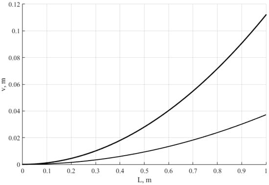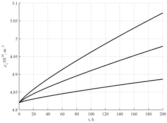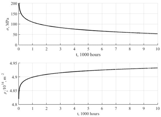 For steady-state creep in bending, we obtain the curvature rate with Equation (7) first. Then, we can obtain the stress distribution (Figure 2) using Equation (2) and solve the boundary value problem () with conditions () and obtain deflection changes under creep. For transient creep in bending, we should first integrate Equation (13) with Equations (1) and (2) and use Equation (12) to solve for deflections with the same boundary and initial conditions. The deflection growth due to creep is shown in Figure 3. As a result, we shall obtain solutions that are similar to the known phenomenological ones, but in addition, there will be a solution for the dislocation density growth from Equation (2), which is depicted in Figure 4. By the same procedures, we obtain shear stress distributions along the radius in steady creep for torsion (Figure 5), as well as the dislocation density evolution (Figure 6). For the relaxation problem, we obtain stress relaxation and dislocation density changes (Figure 7) by integrating Equation (19) with Equation (1).