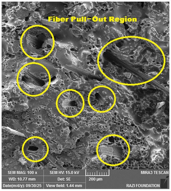 Figure 2 presents the FESEM micrograph of the cryogenically fractured surface of Sample 1, composed of 2 wt% nanochitosan, 5 wt% kenaf fibers, and 20 wt% SMR20 in a PLA matrix. The sample was impact-tested at liquid nitrogen temperature to induce brittle fracture, thereby producing a sharp and well-defined surface suitable for detailed morphological analysis. The micrograph reveals clear evidence of weak interfacial adhesion between the kenaf fibers and the PLA/SMR20 matrix. Notably, numerous fibers are fully pulled out of the matrix, leaving behind distinct longitudinal voids or debonded channels. This pull-out behavior is characteristic of poor fiber matrix bonding, wherein interfacial debonding occurs preferentially over fiber fracture under applied stress. Consequently, the fibers fail to effectively transfer load or dissipate energy, leading to reduced impact resistance, a finding consistent with the relatively low mechanical performance observed for this formulation. A similar observation has been reported by Nouri et al. [26], which shows a good agreement.