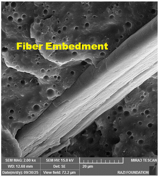 Figure 4 presents the FESEM micrograph of Sample 12, formulated with 4 wt% nanochitosan, 15 wt% kenaf fibers, and 30 wt% SMR20. The image reveals a significant improvement in interfacial performance: under impact loading, the fibers undergo fracture rather than premature debonding and pull-out. This behavior is attributed to the optimal concentration of nanochitosan, which enhances fiber–matrix adhesion and enables efficient stress transfer from the matrix to the reinforcing fibers. Unlike fiber pull-out, which dissipates minimal energy, fiber fracture is an energy-intensive failure mechanism that substantially increases the composite’s capacity to absorb impact energy. The FESEM image clearly shows broken fiber ends embedded in the matrix, confirming strong interfacial bonding. Such microstructural features are indicative of a more ductile and damage-tolerant failure mode, reflecting the system’s enhanced ability to dissipate energy and resist catastrophic fracture. These morphological observations are in excellent agreement with findings reported by other researchers [28,29]. Specifically, Sample 13 demonstrates superior mechanical performance, exhibiting higher tensile strength, elastic modulus, and notably enhanced impact strength compared to formulations containing lower nanochitosan loadings. The FESEM micrographs in Figure 3 and Figure 4 not only corroborate the improved fiber–matrix interfacial adhesion but also clearly elucidate the underlying microstructural mechanisms responsible for the enhanced mechanical properties. Collectively, these results underscore the critical role of nanochitosan as an effective compatibilizer in optimizing the overall performance of PLA/SMR20-based biocomposites.