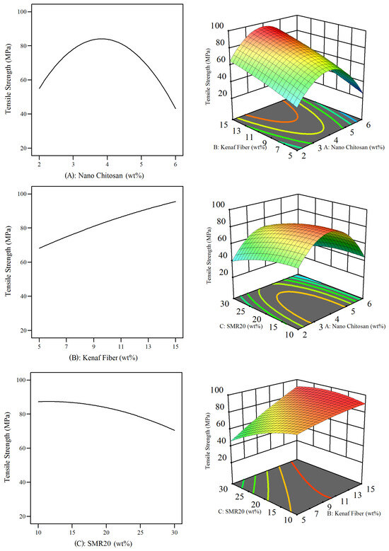 3.2. Effects of Nanochitosan, Kenaf Fiber, and SMR20 Content on Tensile Strength