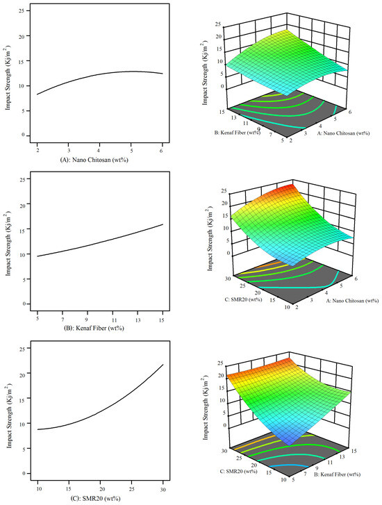 The influence of each constituent material on impact strength is illustrated in the main effects and response surface plots presented in Figure 8. As shown, increasing the nanochitosan content up to 4 wt% leads to a significant improvement in impact strength. However, further addition beyond this threshold, specifically at 6 wt%, results in a noticeable decline in this mechanical property. This non-monotonic behavior can be attributed to a combination of physical, chemical, and morphological factors, including nanoparticle dispersion quality, interfacial adhesion, and the formation of stress-concentrating agglomerates at higher loadings [42].