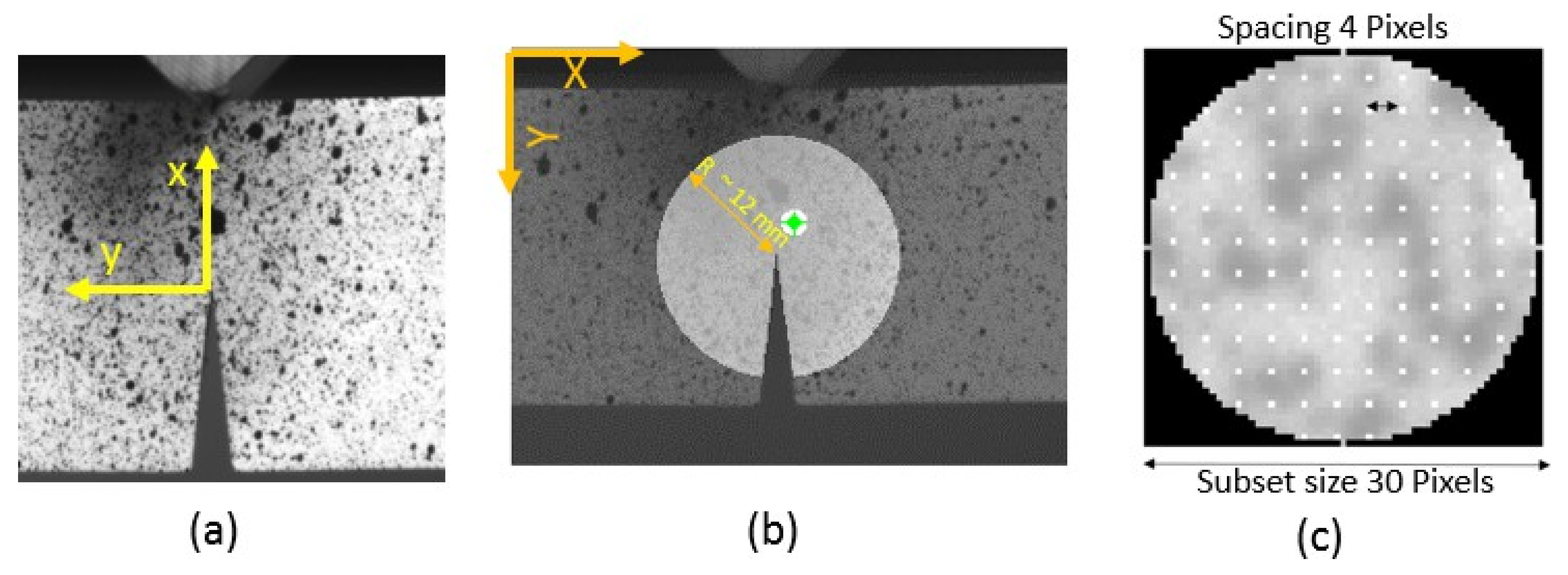 - Yates, J.R.; Zanganeh, M.; Tai, Y.H. Quantifying crack tip displacement fields with DIC. Eng. Fract. Mech. 2010, 77, 2063–2076. [Google Scholar] [CrossRef]