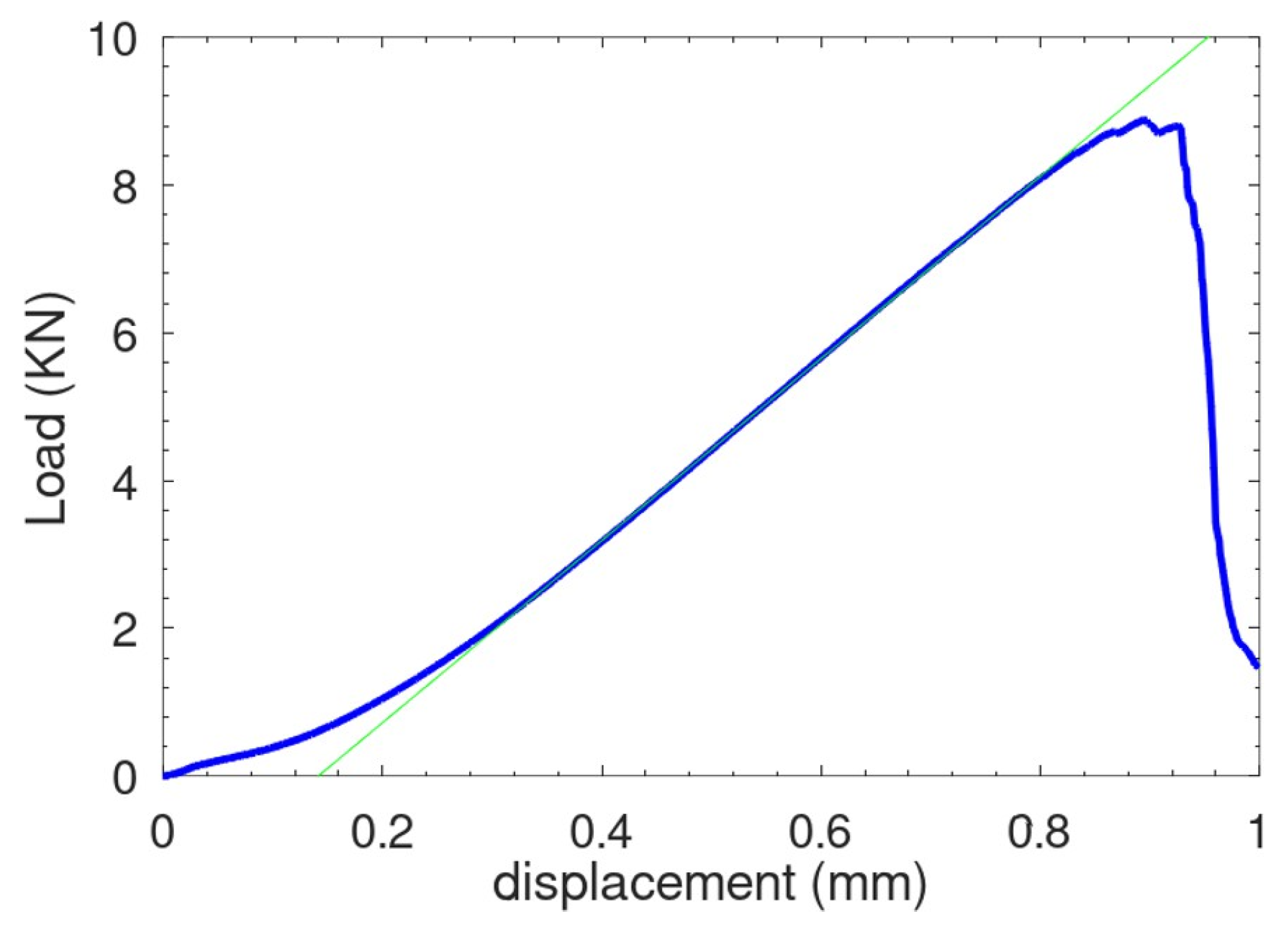 Figure 3 shows the load–displacement curve of the sample, revealing two distinct stages in the ascending portion of the graph. The first regime is for displacement d < 0.15 mm. It is characterized by a low stiffness due to setting the test. The second one is for d > 0.2 mm, where the curve becomes perfectly linear. The slope of this part is equal to 12.16 kN·mm