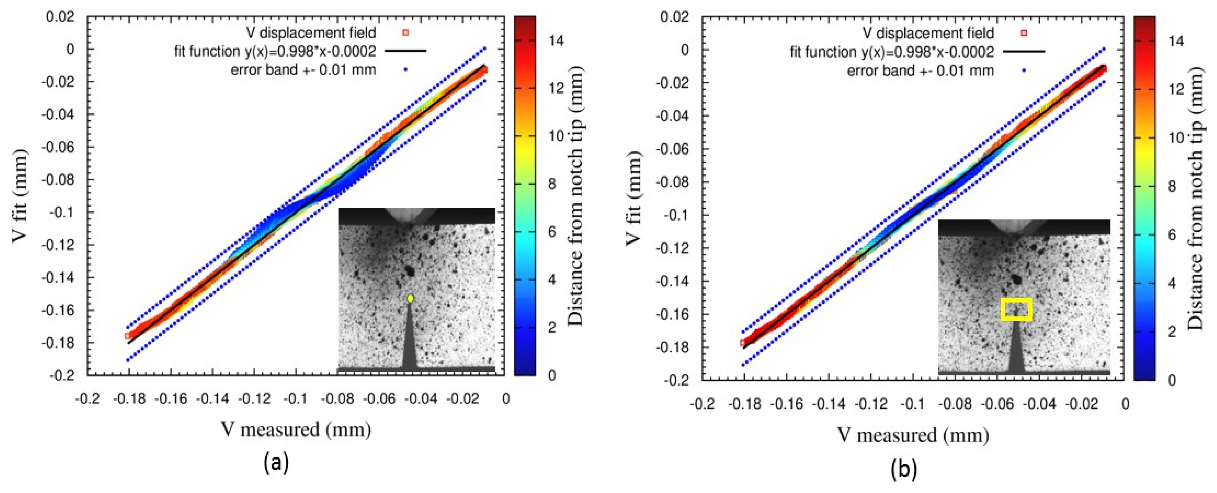 Figure 7 shows the scatter plot between the fitted and the measured displacement field for both methods. Both scatters show a good correlation; however, the scatter width is larger if the tip is determined by geometric method. These results depict that accurate identification of notch or crack tip can be achieved by using the optimization method. The displacement field of the snapshot that corresponds to the onset of the crack was used to determine the critical SIF K