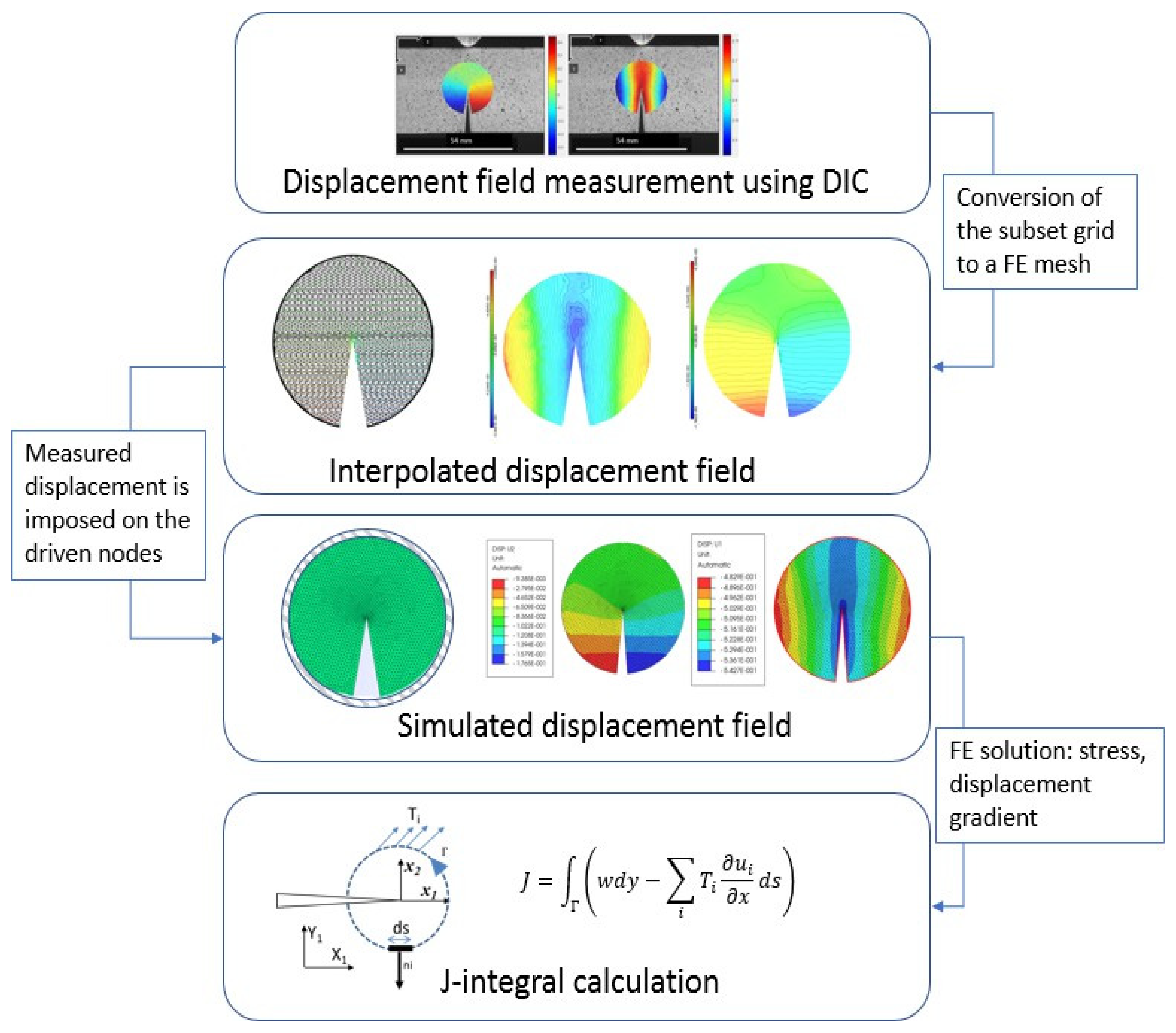Finally, the critical J-integral J∗ of the sample has determined using a finite element sub-model at the crack tip vicinity. The sub-model deformation was driven by the displacement field measured by DIC. The path independence of J-integral was verified. The critical value of J-integral found is It is to be noted that -integral determination represents a verification to the Stress Intensity Factor calculation.