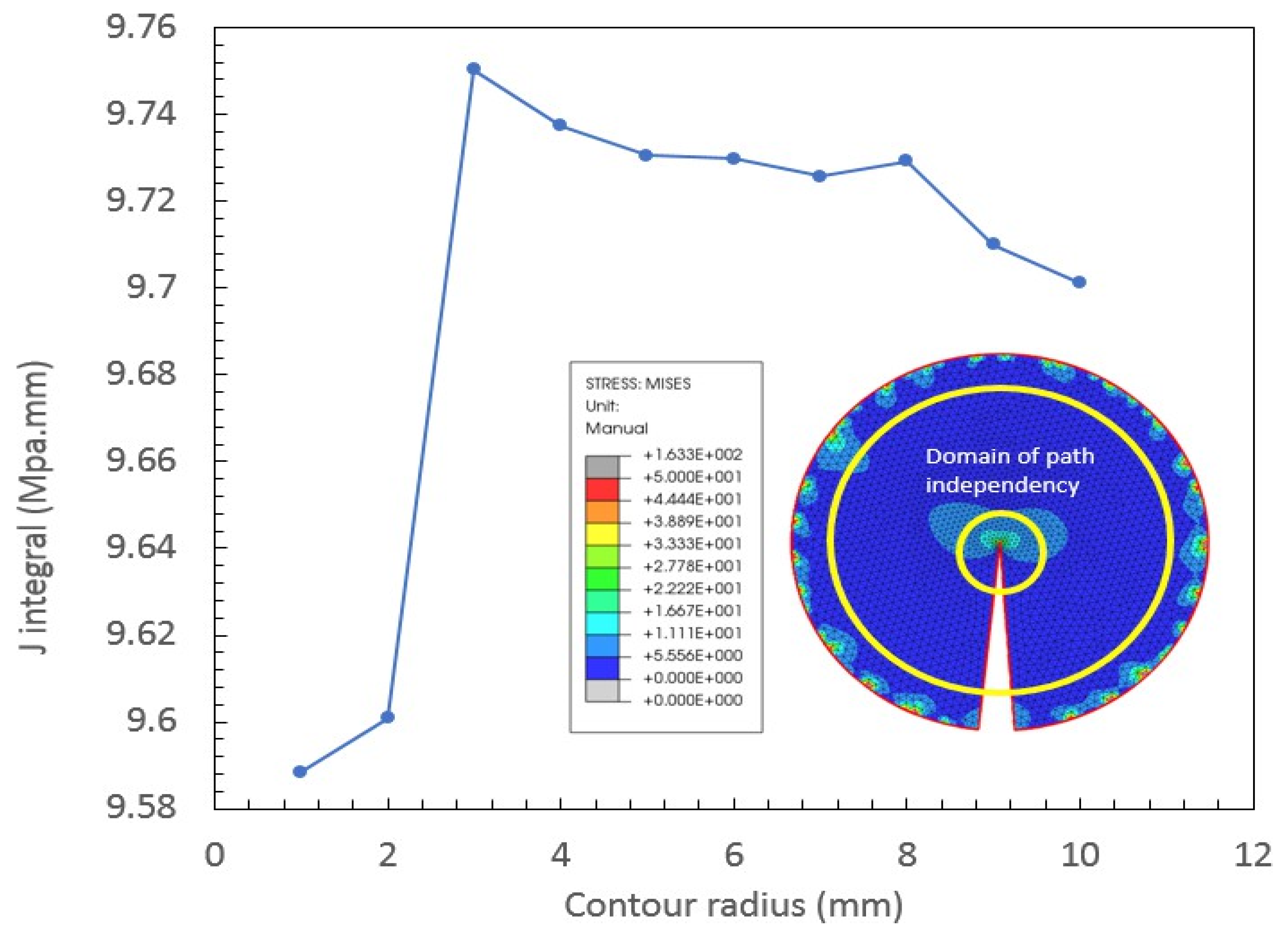 Figure 9 shows the J-integral value with respect to the contour radius. The result depicts that J-integral becomes path independent for contour radius
