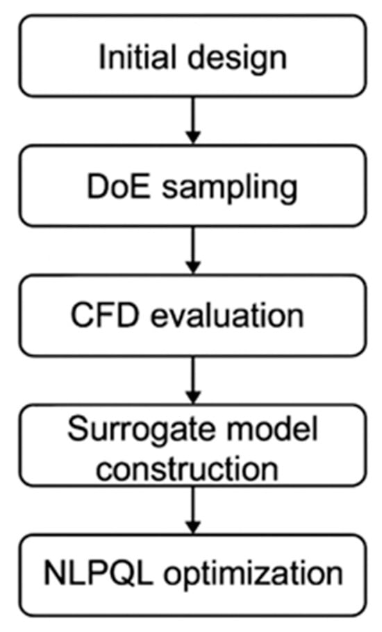 The surrogate-based model is then optimized using a gradient-based Nonlinear Programming by Quadratic Lagrangian (NLPQL) algorithm [34] to identify the minimum-drag configuration satisfying the imposed constraints. The iterative sequence, comprising DoE generation, CFD evaluation, surrogate construction, and optimization, is summarized in Figure 3.