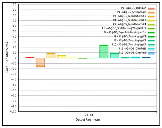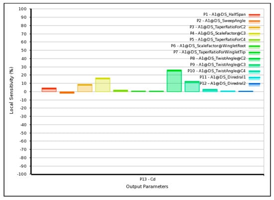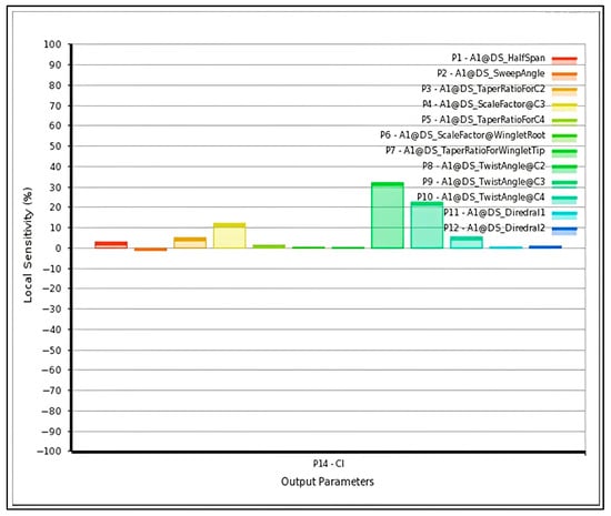 To quantify the influence of each geometric parameter on aerodynamic performance, a local sensitivity analysis is performed using the fitted response surfaces. The sensitivity intensity of the design variable is computed as the normalized partial derivative of the response function, as described in Equation (10) as: